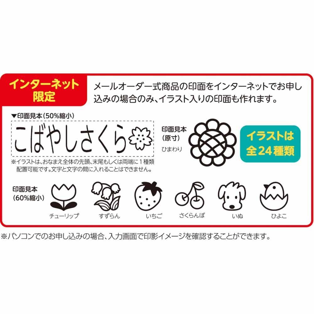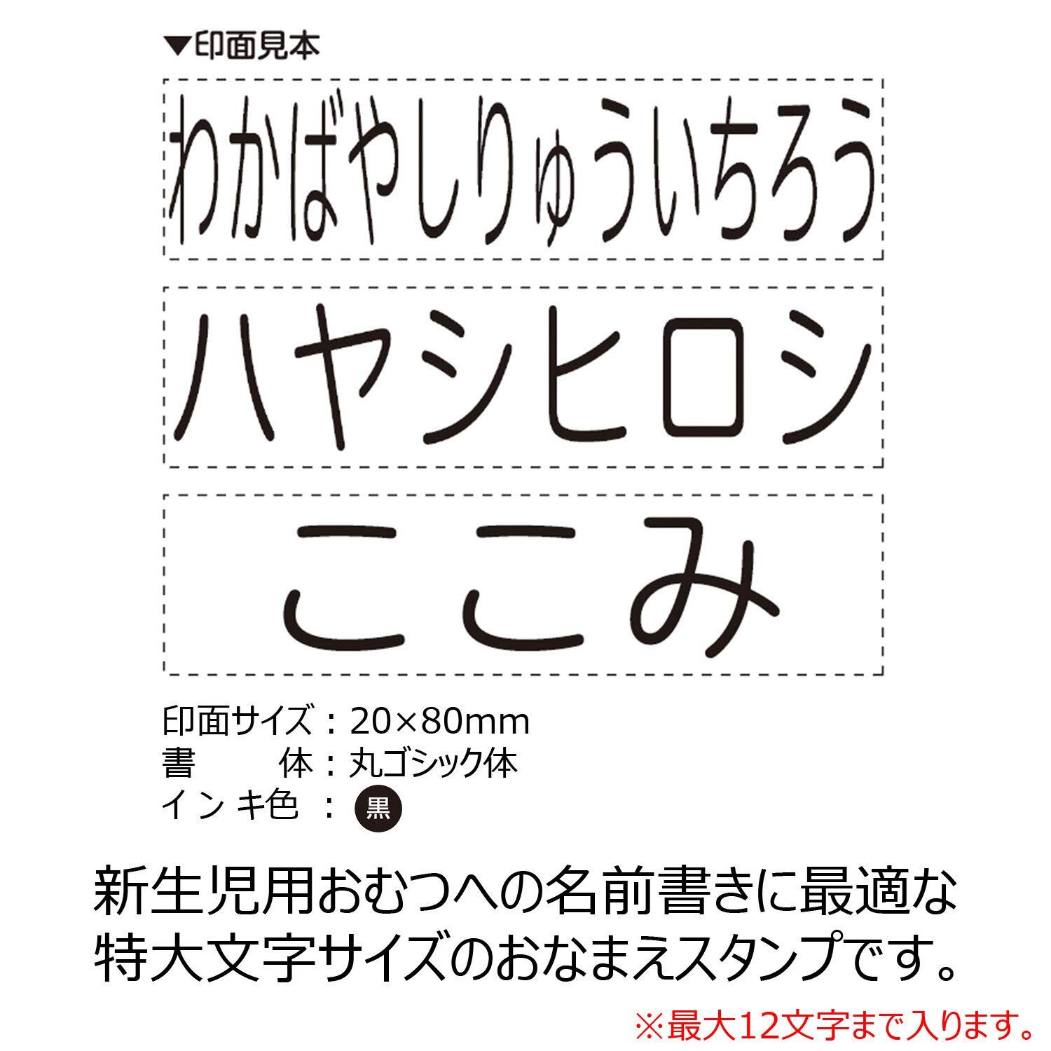 1名前書きの時間短縮! 水ににじまず、乾きの速い油性インキを採用。 たくさんのおむつへの名前書きもスタンプで簡単にできます。 2ひと目で確認できる! 名前が読みやすい大きな文字サイズのスタンプです。 3おむつ以外への名前書きもおまかせ! 紙・プラスチック・金属・布・木などにスタンプできます。 ※材質(軟質塩ビ等)によっては、スタンプに適していないものもございます。 また、乾燥が遅くなったり、印影のニジミが生じたりする場合がありますので確認の上ご使用ください