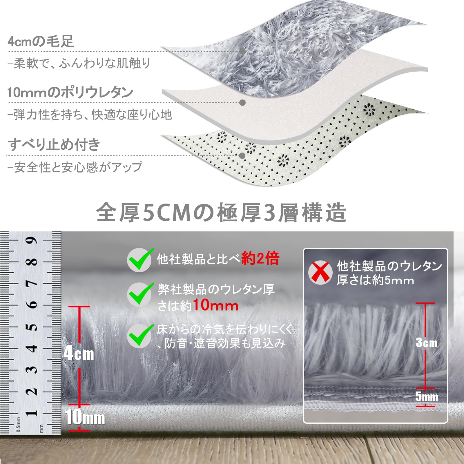 ??【厚手版仕様】サイズ:120x160cm 、重量1.1KG。①毛足の長さ:約40mm ②ポリウレタンの厚さ:約10mm(他社より5mm厚い)③裏地:不織布(滑り止め付き) 。弾性が抜群、防音効果が優れます。