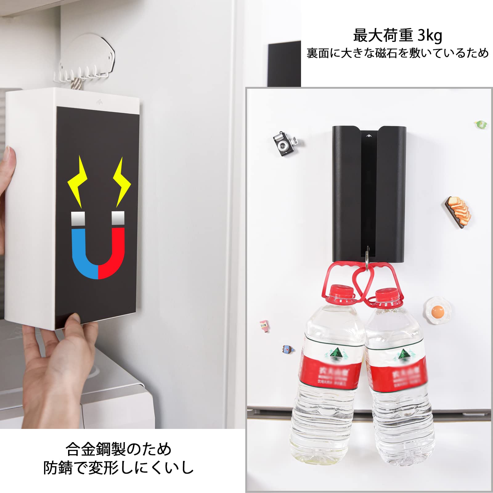 【強力な磁力】3㎏を荷重できます。ティッシュケースの裏面に大きな磁石を敷いているため、冷蔵庫やオーブンなど家具の金属表面にぴったりと貼り付けて落ちたりもしません。取り外す時も痕跡が残りません。実用的です。