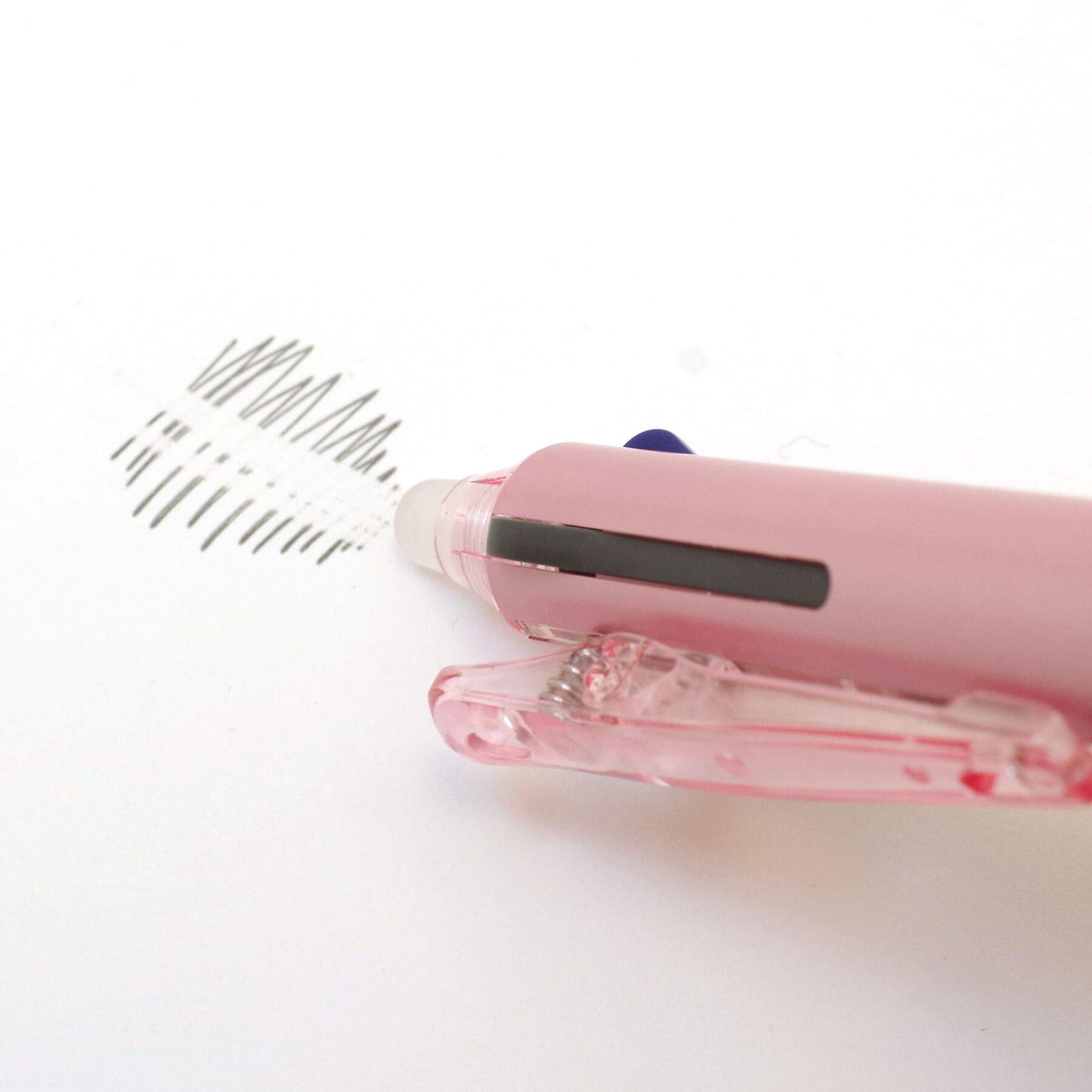 温度変化によりインキを無色にする「フリクションインキ」を搭載した新発想のボールペン。「フリクションインキ」には消色温度が設定されているため、筆跡をボディ後部の専用ラバーで擦ることで生じる摩擦熱によりインキの色が無色に変わり、筆跡を消すことができます。