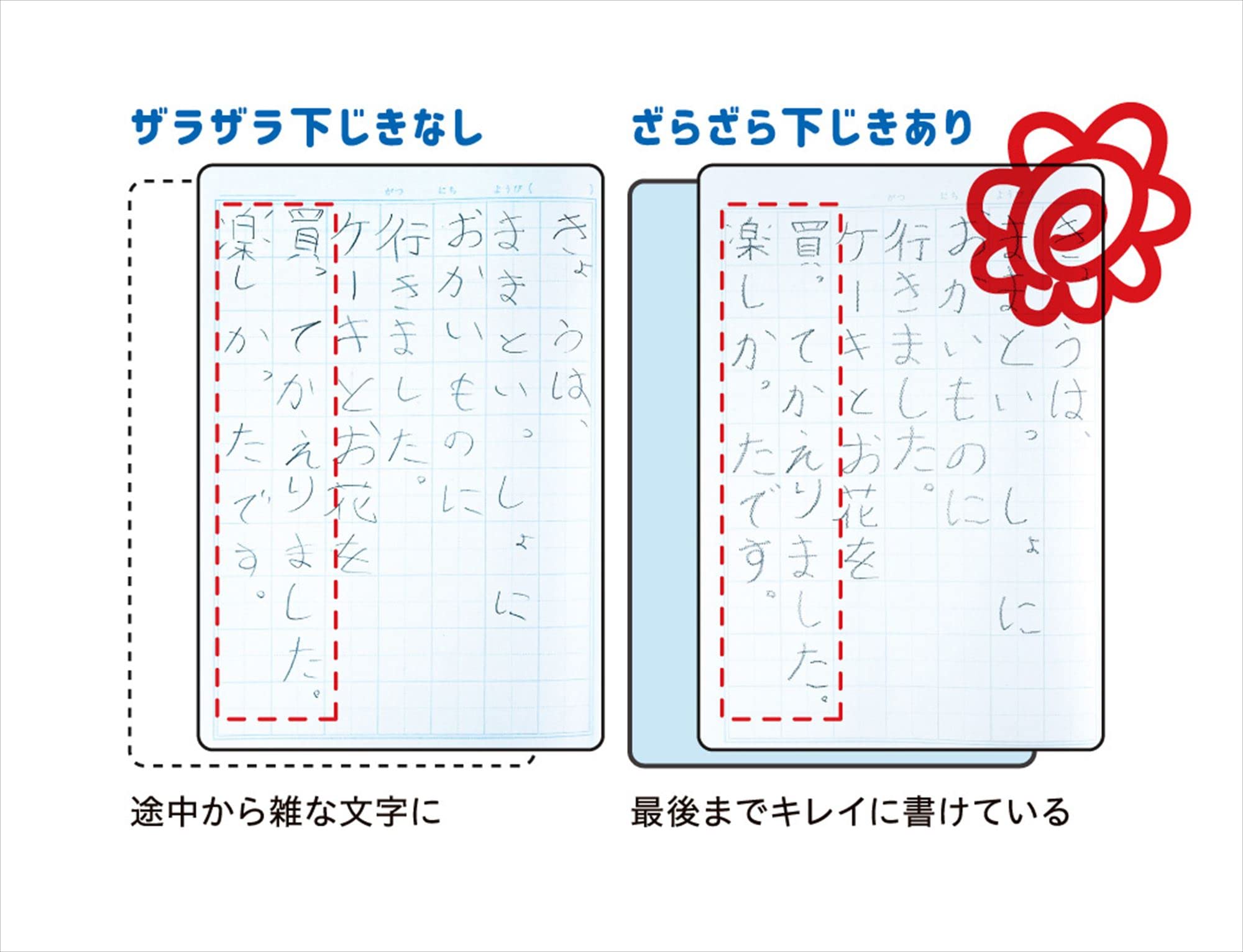 表側のザラザラ面は、国語や書写などのしっかり丁寧に書く学習に最適です。裏側のツルツル面は、算数のひっ算など、急いで書く必要のある学習に最適です。