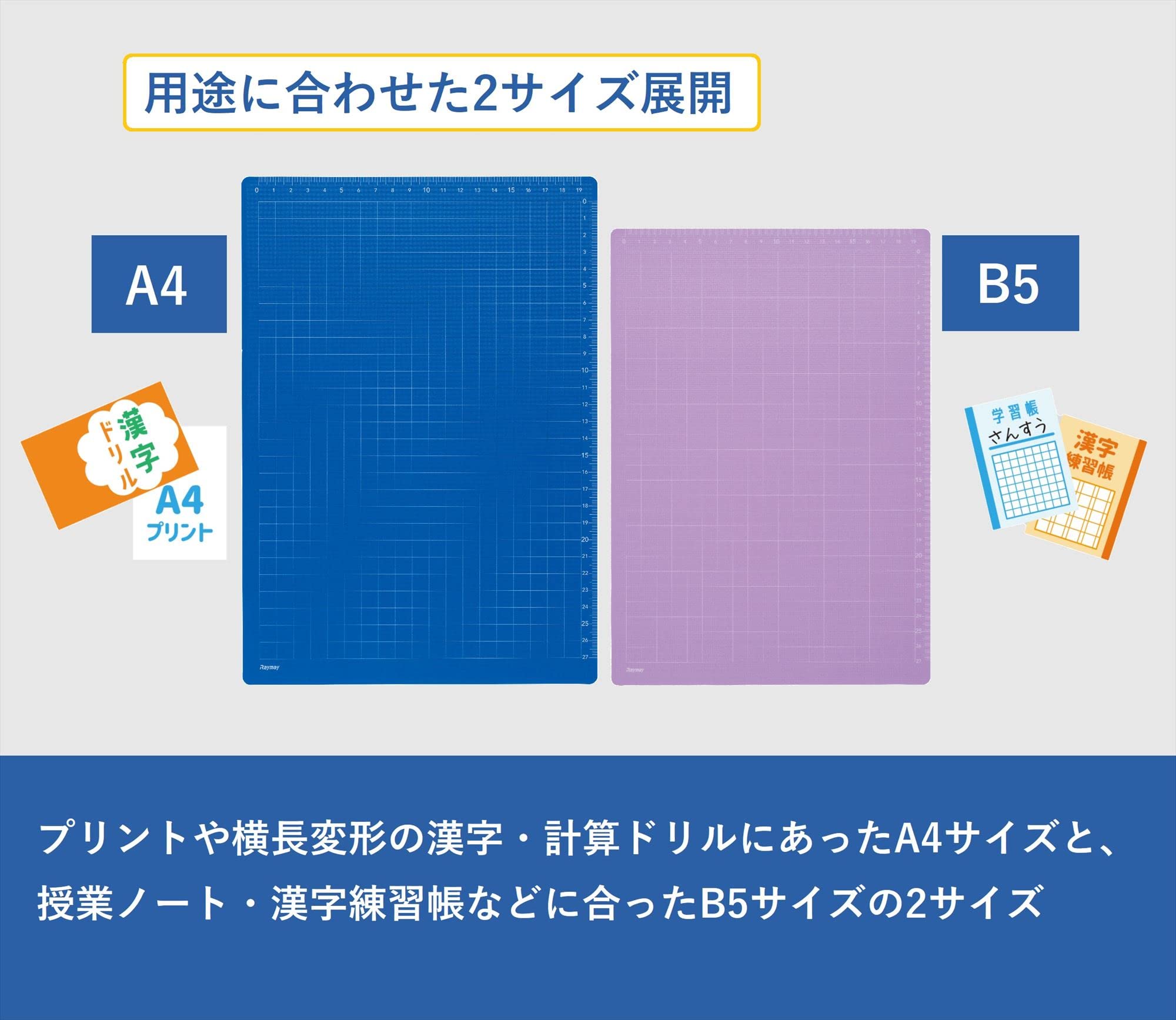 プリントや横長変形の漢字・計算ドリルに合ったA4サイズと、授業ノート・漢字練習帳などに合ったB5サイズの2サイズ展開。