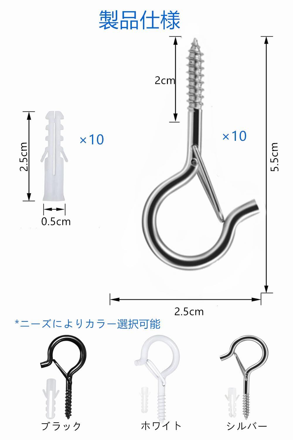 10個入り天井 フック全長55 mm 炭素鋼 安全バックルデザイン搭載 ねじ込み式ネジフック 壁フック ハンガーフック/植物/台所用品/風鈴などの吊り下げに最適 プラスチック拡張ピン付き (シルバー)