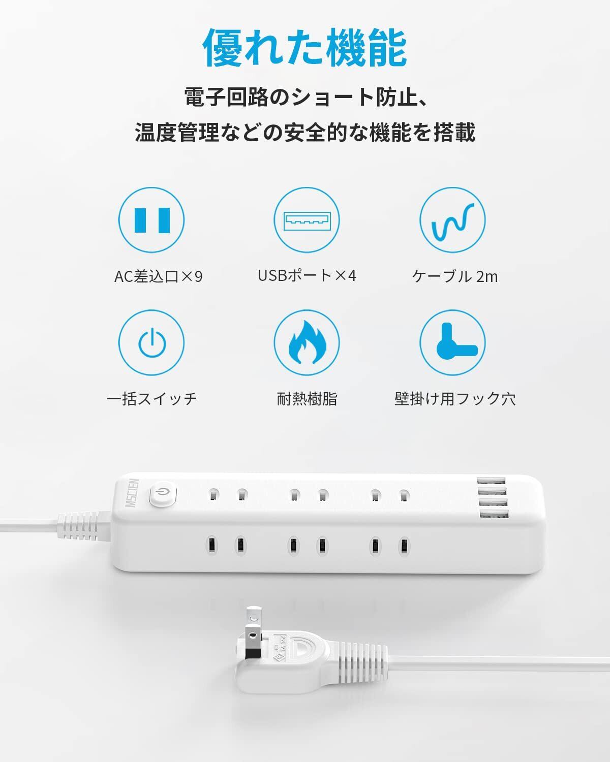 Mscienエムサイン 延長コード 2m 電源タップ usb付き 9個AC口 4個USBポート テーブルタップ oaタップ たこあしコンセント 一括スイッチ付き usb コンセント 分岐 蛸足コンセント