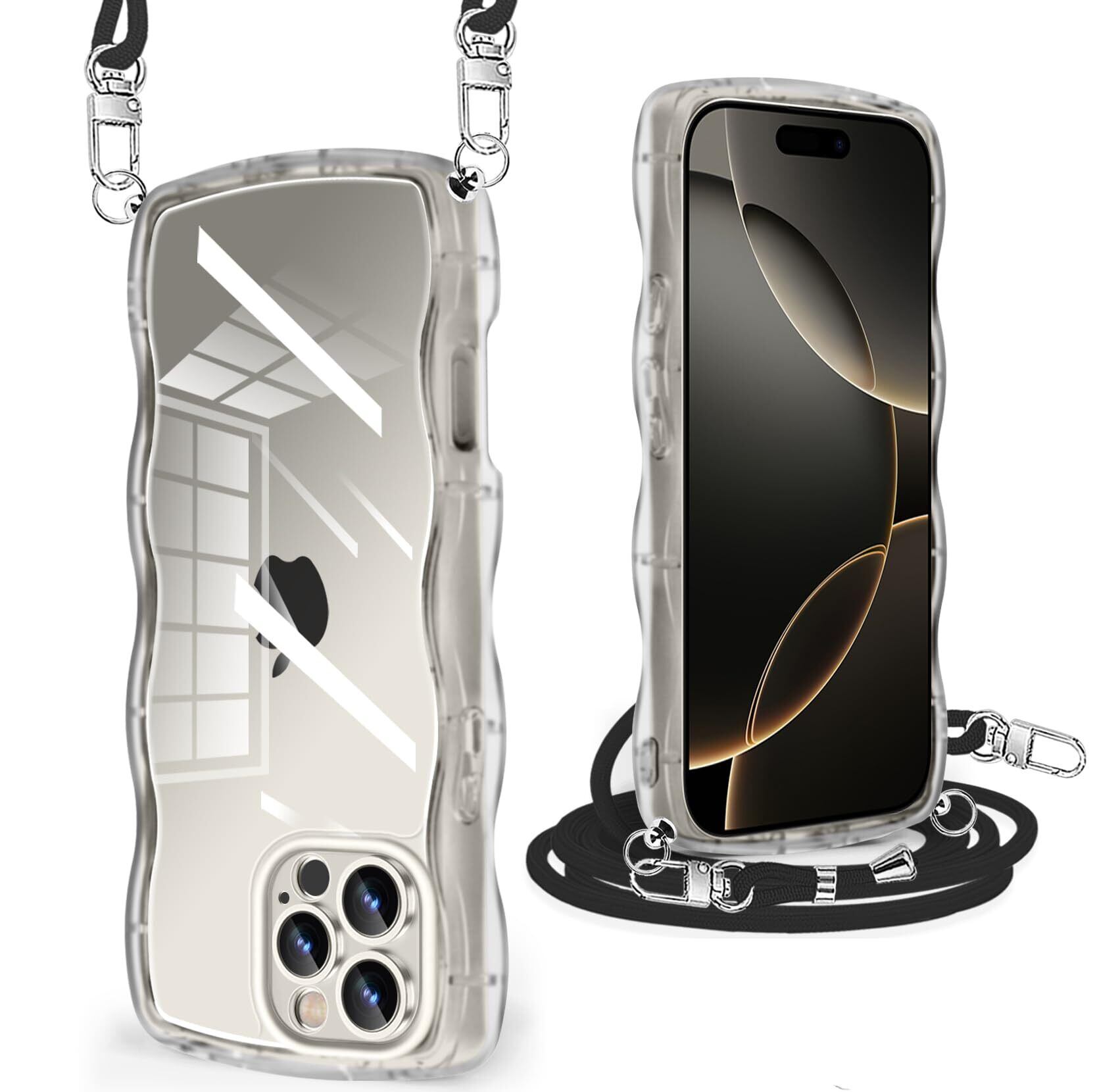 iPhone 16 Pro Max 用 ケース クリア ショルダー ストラップ付き アイフォン 16 Pro Max 用 カバー かわいい 波状フレーム 人気 耐衝撃 透明 iPhone16 Pro Max 用 スマホケース 首かけ 肩掛け 薄型 軽量 QIワイヤレス充電対応(透明)