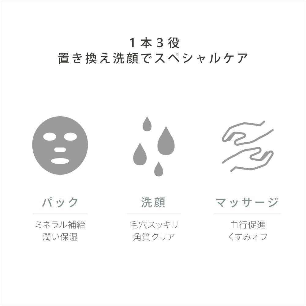 【ポイント2】:『1本3役、置き換え洗顔でスペシャルケア』メイクや汗、皮脂による汚れは毎日溜まり、普段のケアだけでは除去しきれていないことも。普段お使いの洗顔と週に1~2回の置き換えで、まるでエステに通っているかのようななめらか、つるすべ肌へ。