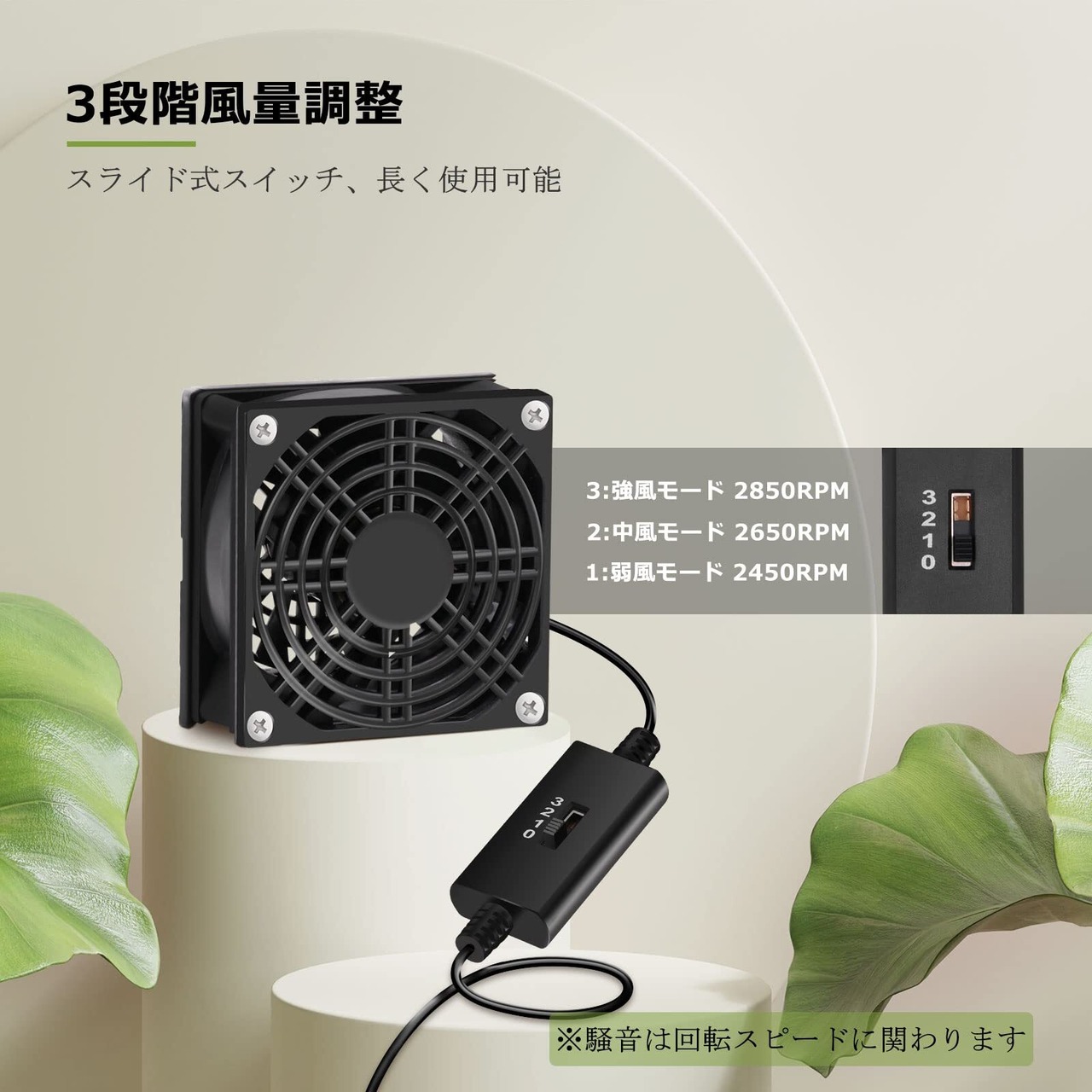 3段階回転スピードの調整ができるため、ご利用環境又は端末により、風量の調整機能は使い勝手がよいです。騒音値が回転スピードに関わりますため、弱モードにした場合、静かに稼働します。