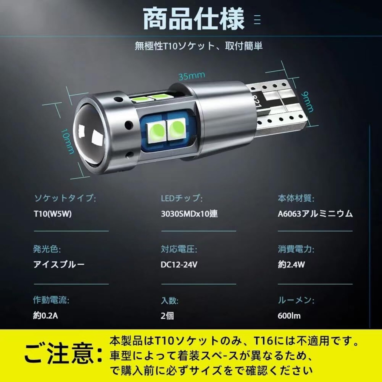 T10 LED アイスブルー 爆光 12V 24V ポジションランプ ルームランプ CANBUS キャンセラー内蔵 無極性 レンズ付き 3030 SMD 10連 2.4W 水色 2個入