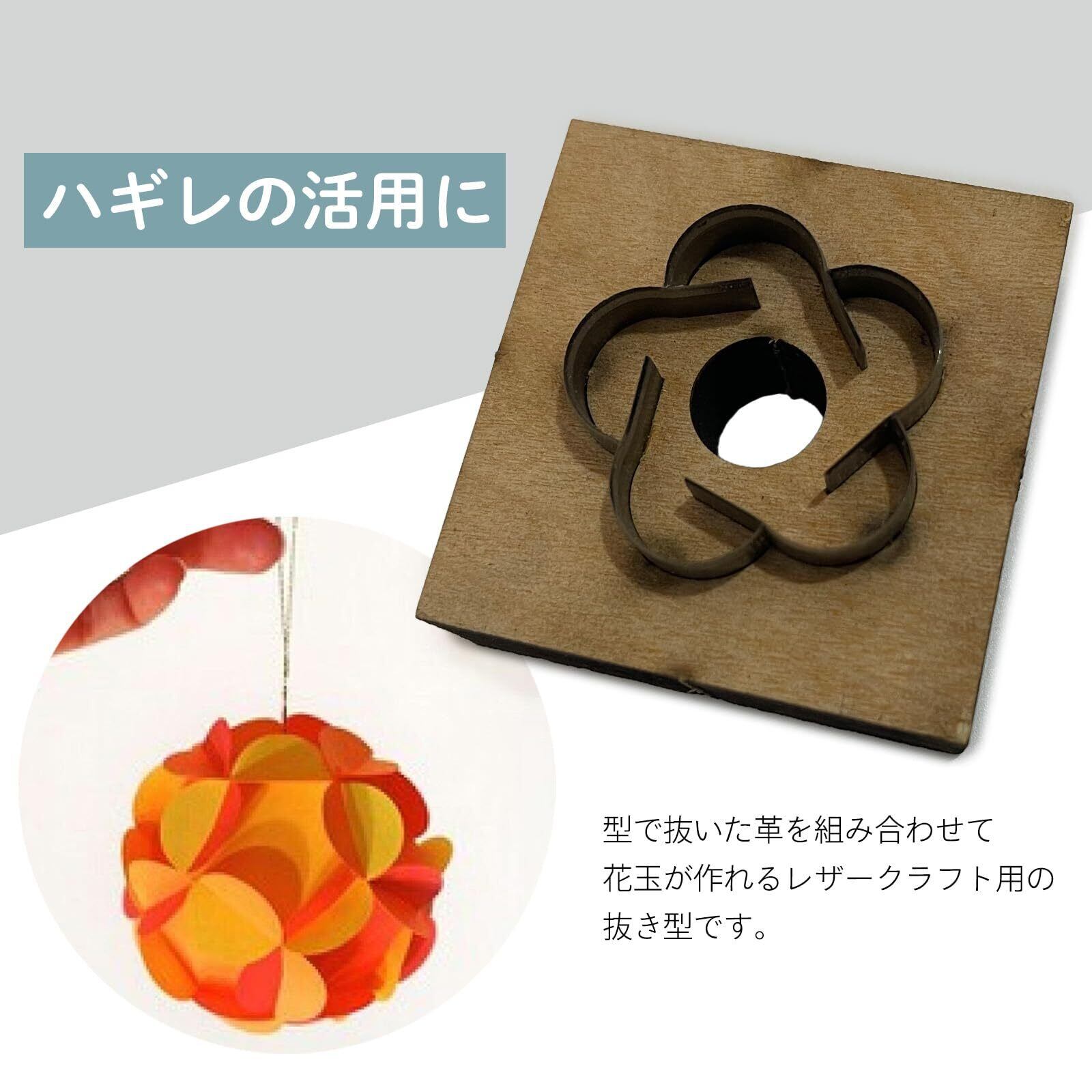 レザークラフト型抜きは、革細工の制作に最適な抜き型です。革の上に抜き型を置き、ゴム板を挟んで木づちやゴム製ハンマーで叩くことで、均一な形状に切り抜くことができます。キーホルダーや髪飾り、可愛らしいインテリアとしての花玉作りなど、さまざまな作品に活用できます。
