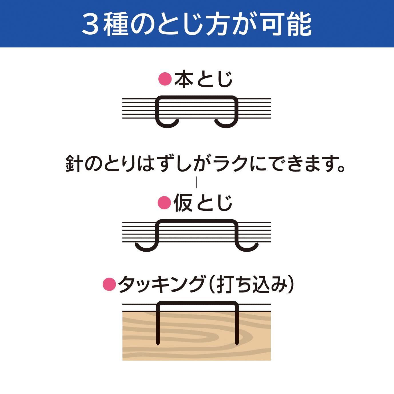 1台で3種類のとじ方ができる中型ハンディータイプのホッチキス。