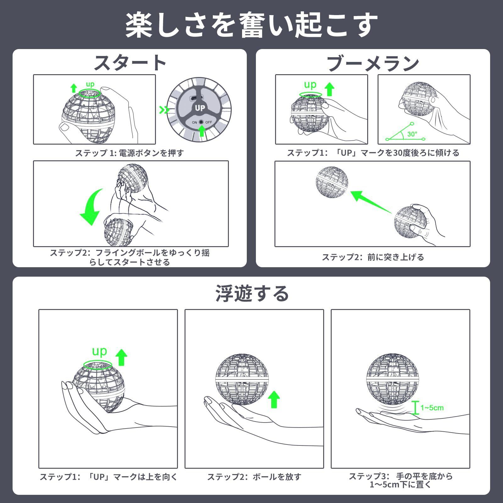 軽量で携帯性に優れている:このジャイロ飛行ボールは厳しいテストを経て、柔らかいながらも耐久性のある高品質な素材を使用している。耐落下性、軽量性、柔軟性に優れている。このおもちゃは、お子様が簡単に破損する心配がありません。また、家具などにぶつかると自動的に停止する。