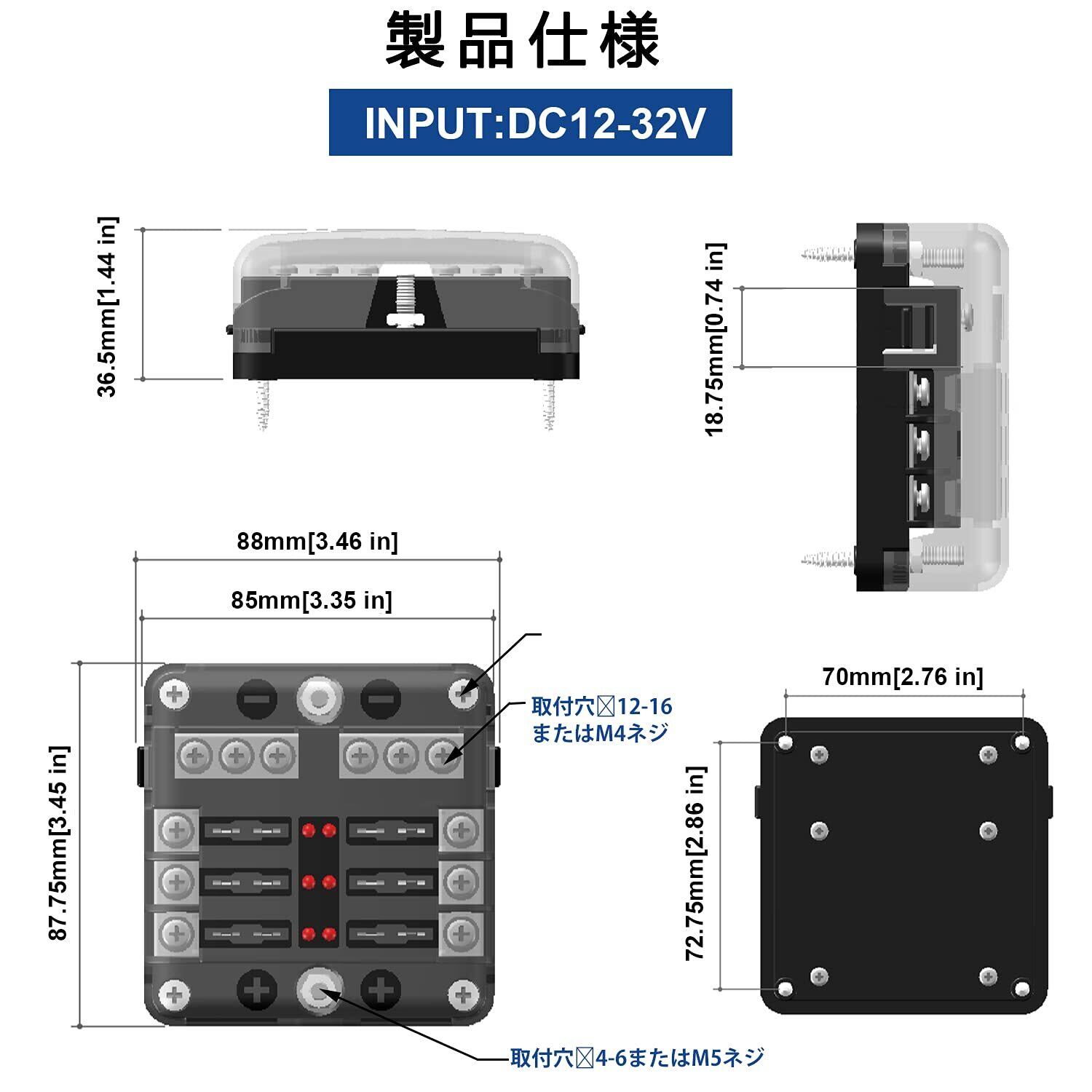 LEDインジケータライト: 対応するヒューズが切断されると、すぐに赤色のLEDインジケータが点灯し、切断されたヒューズの識別と交換ことができます。