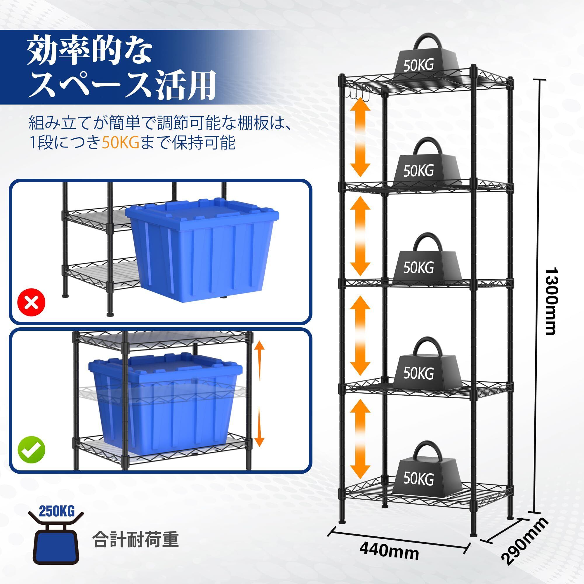 WORKPRO スチールラック 5段 耐荷重250kg メタルラック キッチンシェルフ 棚 ポール径16mm 幅44×奥行29×高さ130cm フック付き 防サビ加工 省スペース収納 キッチン ガレージ ランドリー 商品陳列 | allstore1