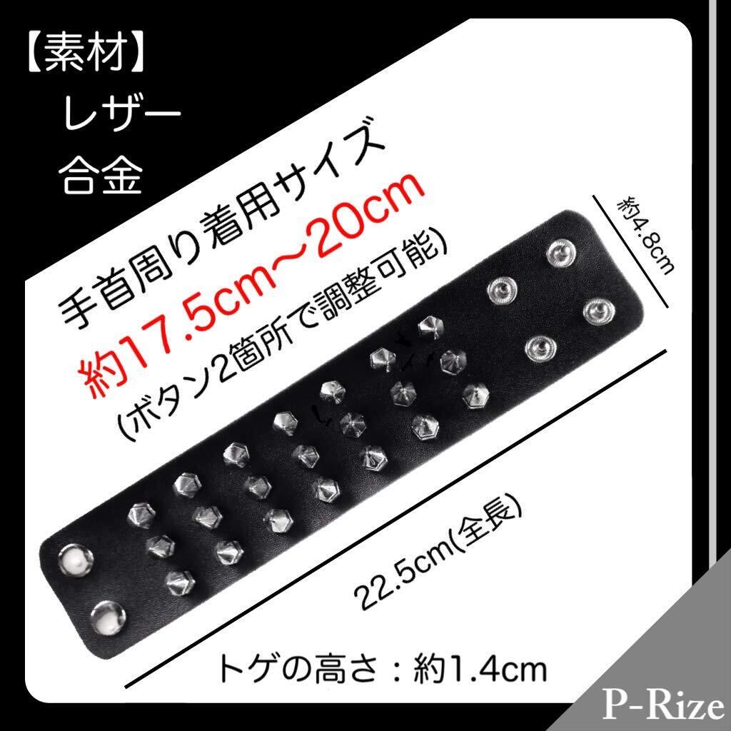手首周り着用サイズ:約17.5cm~20cm(それ以下でも着用は可能) 全長:約22.5cm 幅:約4.8cm トゲの高さ:約1.4cm 素材:レザー、合金 カラー:ブラック
