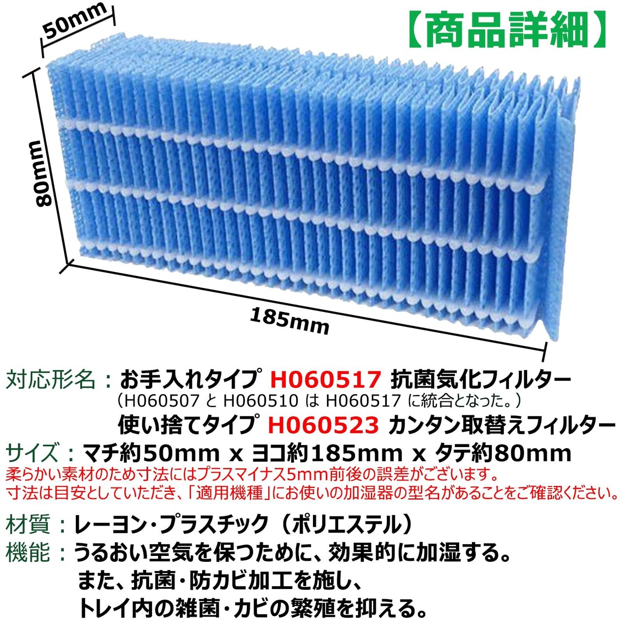 【形名】お手入れタイプ H060517 抗菌気化フィルター (H060507 と H060510 は H060517 に統合となった。)/ 使い捨てタイプ H060523 カンタン取替えフィルター 。材質:レーヨン・プラスチック。パッケージ内容: H060517 / H060507 / H060510 抗菌気化加湿フィルター x 2