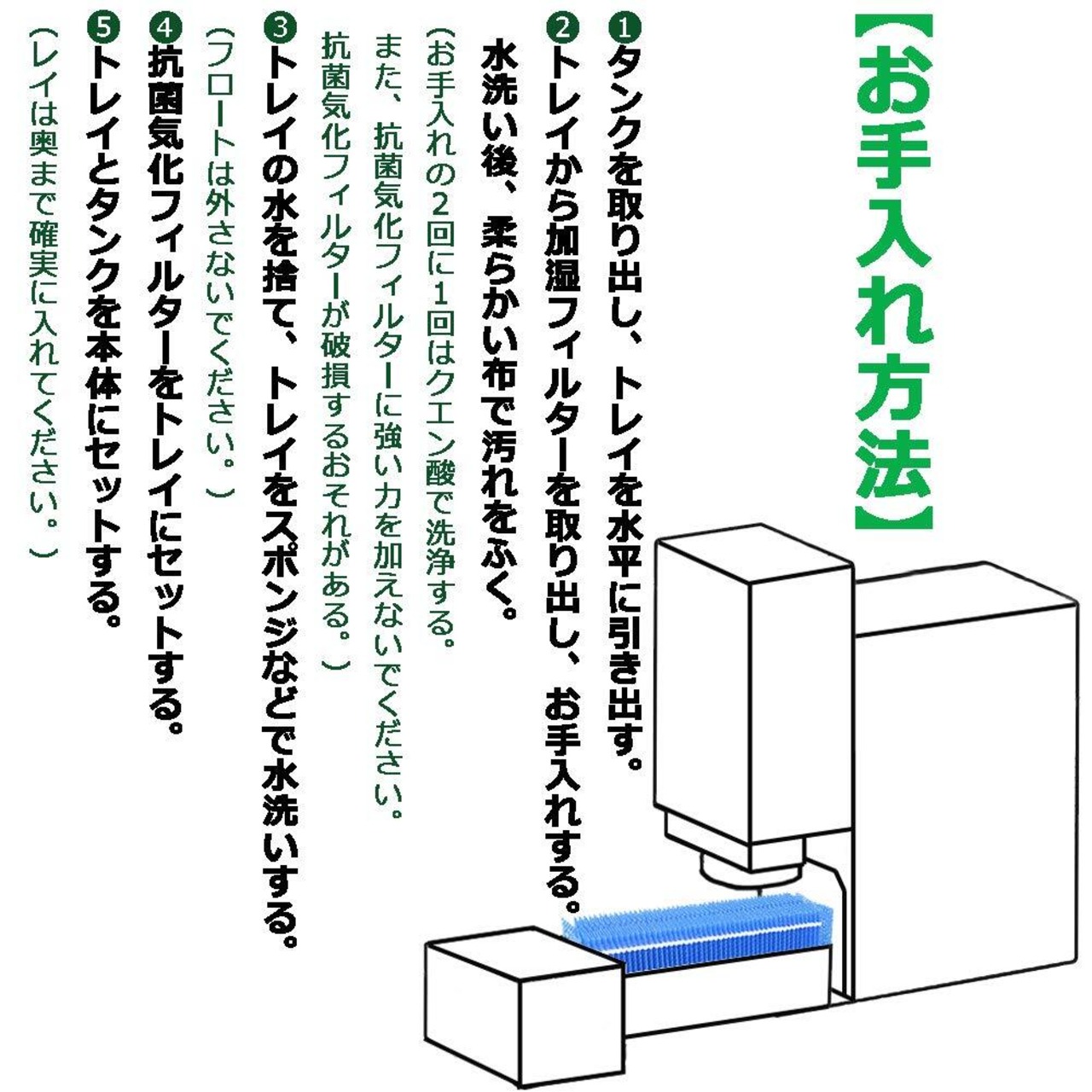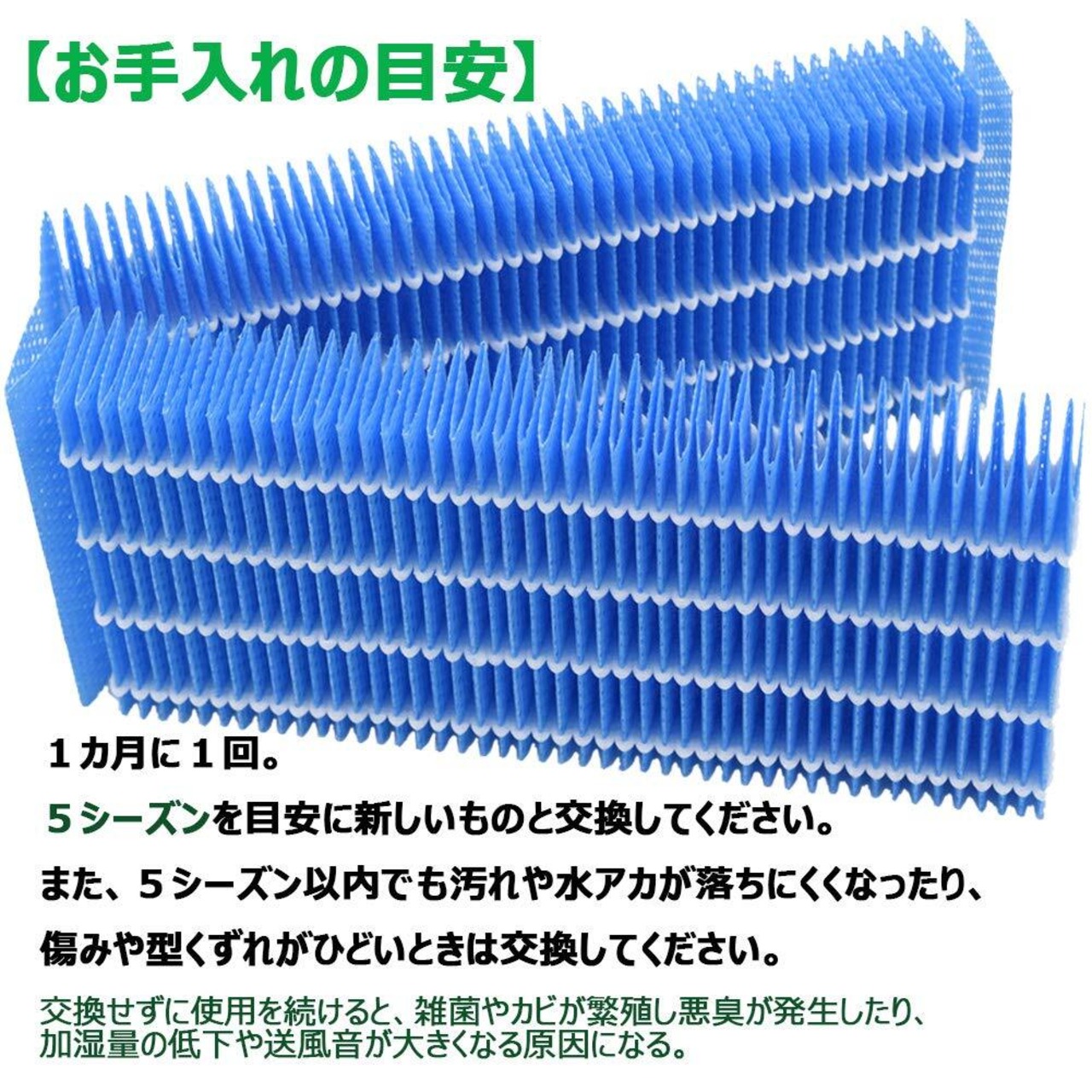【お手入れの目安】1カ月に1回。また、5シーズンを目安に新しいものと交換してください。お手入れや交換をせずに使用を続けると、雑菌やカビが繁殖し悪臭が発生したり、加湿量の低下や送風音が大きくなる原因になる。
