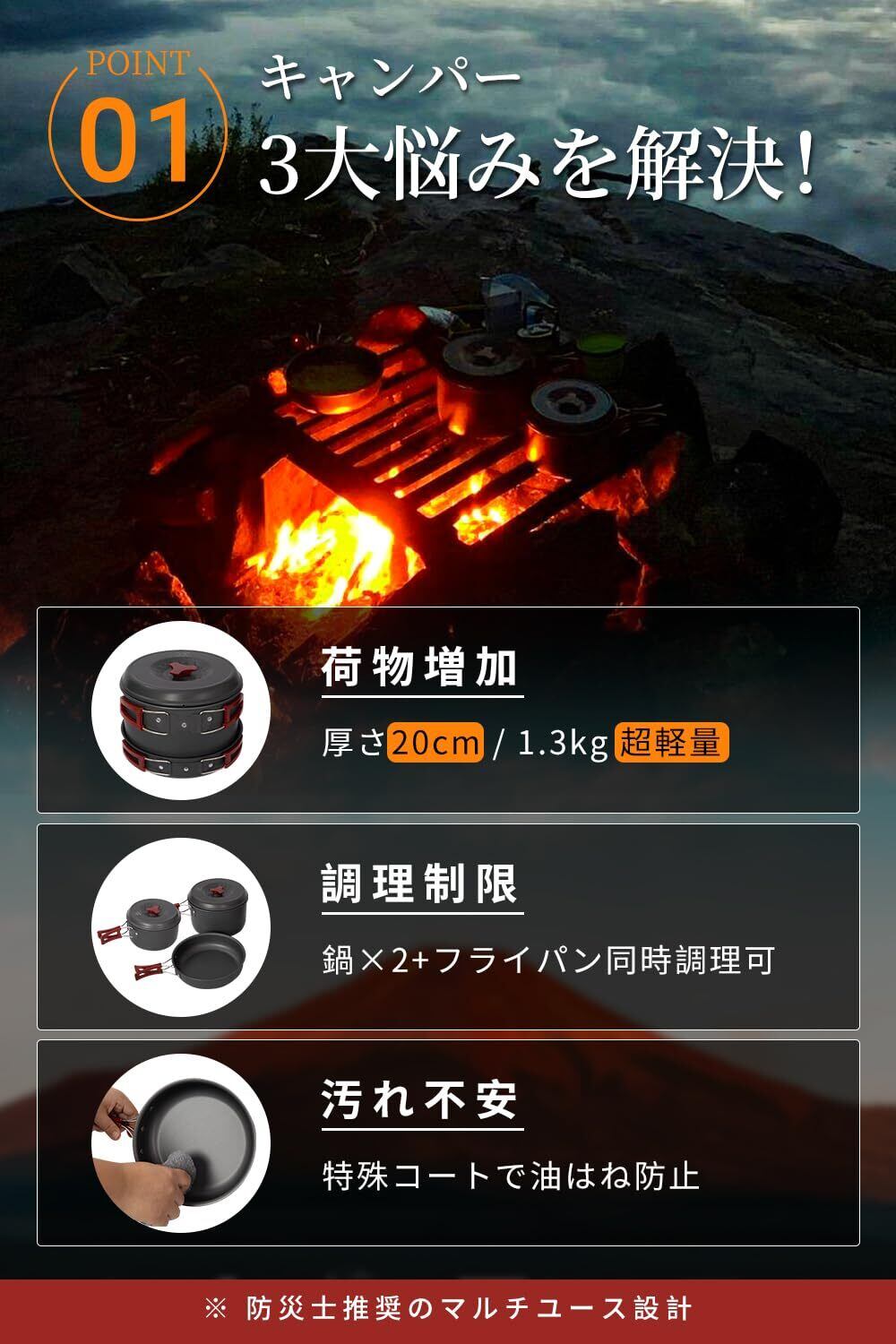 【驚きの軽量設計&スリム収納|登山・防災にも】総重量は約1.3kgと非常に軽量ながら、必要な調理器具がすべて揃っており、効率よく収納可能。収納時の厚みはわずか約20cmでバックパックにもすっきり収まります。「荷物は減らしたいけど、ちゃんと調理もしたい」そんな登山者やソロキャンパーにもおすすめです。災害時の備えとしても安心。
