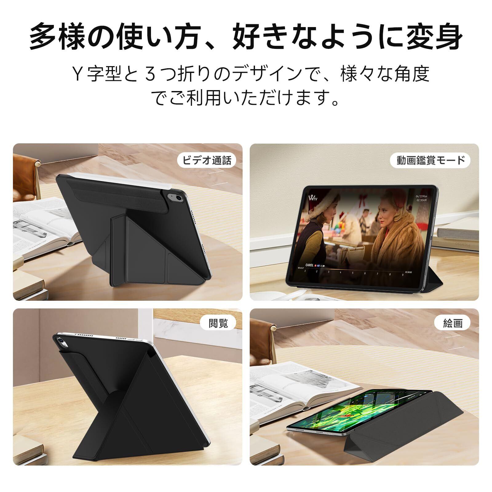 【多機能スタンド機能&角度調整】横置きと縦置き両方に対応する三角スタンド機能で、使用シーンに合わせた自由な角度調整が可能です。4つの角度を折り紙のように折りたたんで、動画視聴や作業、ネットサーフィンなど、どんな場面でも快適にお使い頂けます。安定性に優れた設計で、倒れる心配もありません。