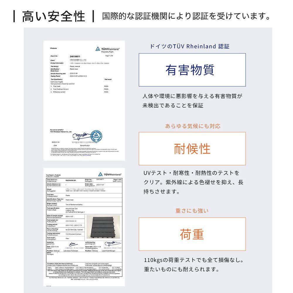 プロテックのジョイントパネルシリーズとジョイント形状が同じの為自由に組み合わせて設置できます。 プロテックのアカシアウッドパネル・人工芝と互換性があります。 ※他社製品との互換性はございません。 本製品は重量物のため、お客様都合での返品はお受けいたしかねますことをご了承願います。