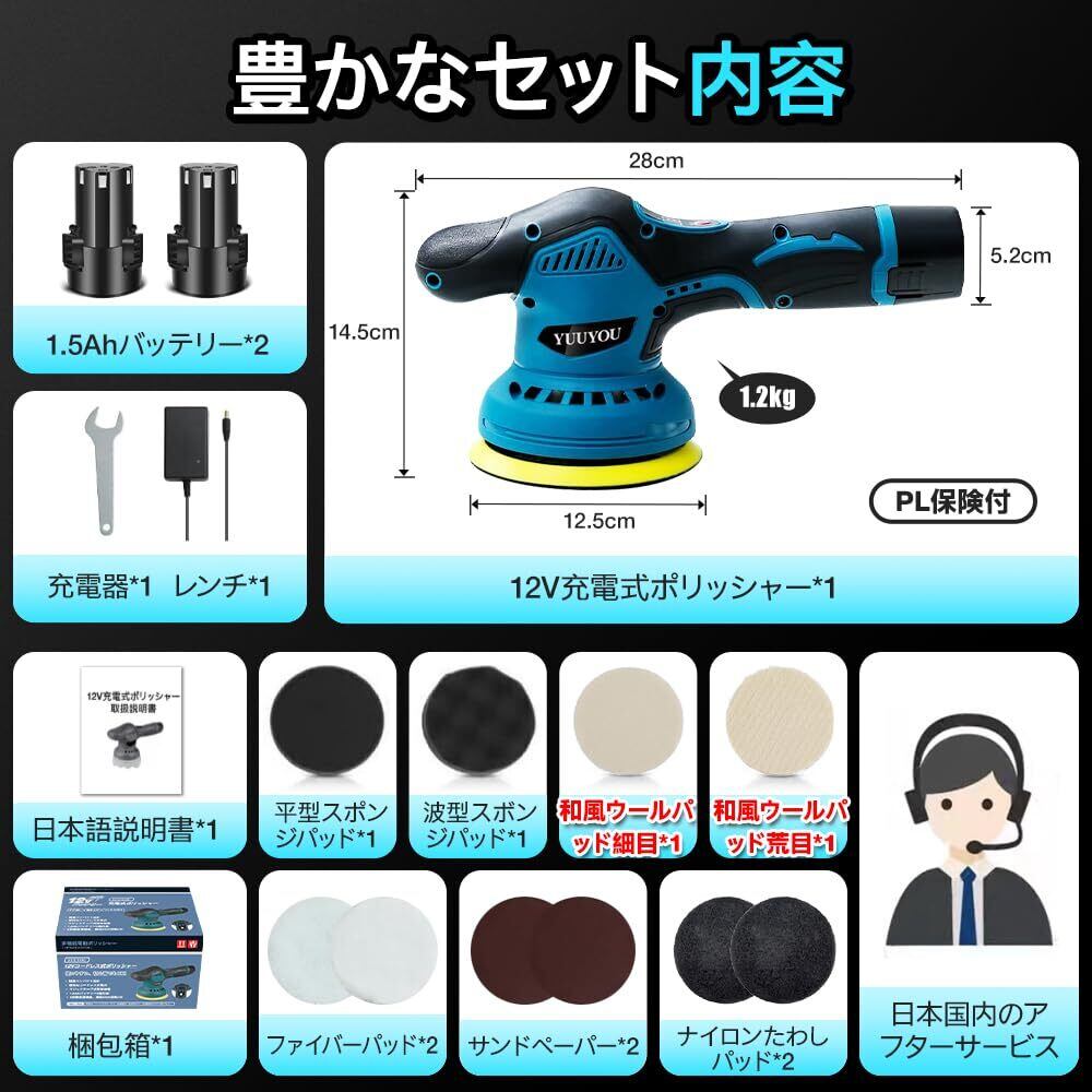 ▲【パッケージ内容12ヶ月品質】セット内容:12V充電式ポリッシャー*1、1.5Ahバッテリー*2、和風ウールパッド細目*1、和風ウールパッド荒目*1、波型スボンジパッド*1、平型スポンジパッド*1、ナイロンたわしパッド*2、ファイバーパッド*2、サンドペーパー*2、日本語説明書*1。本体重量:1.2kg、サイズ:28*14.5*12.5cm。YUUYOUブランドを提供する有容合同会社は信用とサービスを重視する日本の会社です。弊社のポリッシャーにはPL保険に加入し、PSE認証も取得しておりますので、ご安心してご利用ください。また、YUUYOUポリッシャーは12ヶ月品質とアフターサービスを提供しております。ご質問があった場合、又は万が一商品に不具合が生じた場合があるなら、いつでもお気軽にお問い合わせください。必ず最善を尽くし、サービスを対応致します。
