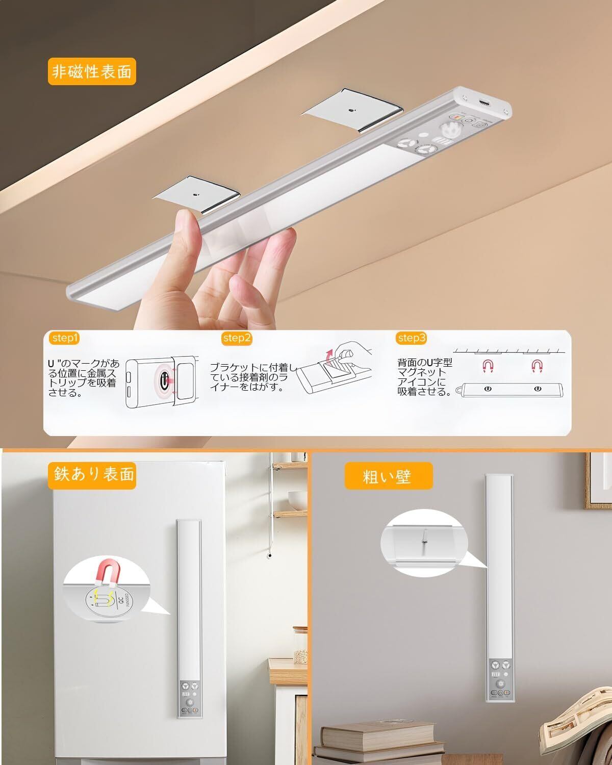 【取付簡単・テープ】磁石が弱すぎ、落とす心配がある?他店のセンサーライトと比較して、当社のは工具不要で鉄面に簡単に取り付けでき、いつでも人感センサーライトを外せて懐中電灯としても使用可能です。また、高粘度のテープ付き、お手軽いクローゼット・階段・玄関・廊下・寝室・キッチンなどご装置したい場所に貼り付けできます。