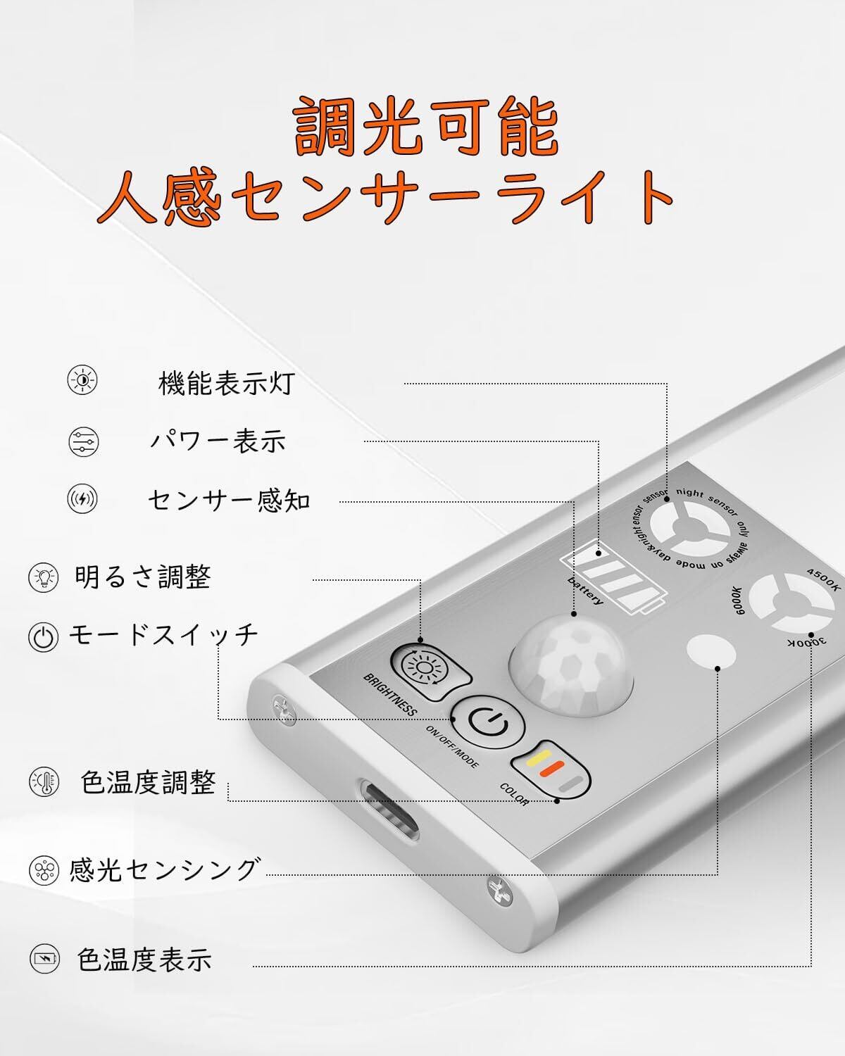 【連続点灯60時間可】人感センサーライト 充電式 室内 超薄 キャビネットライト クローゼット キッチン フットライト 足元灯 玄関灯 室内照明 電球色 昼白色 30cm 1個入