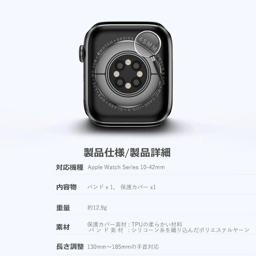 保護カバー素材 : TPUの柔らかい材料 バンド素材 : シリコーン糸を織り込んだポリエステルヤーン 対応機種:Apple Watch Series 9/8/7/6/5/4/3/2/1/SEの38mm/40mm/41mm/42mm/44mm/45mm/46mm全シリーズに対応出来ます。 お手入れが簡単:防汚性があり、毎日お手入れする必要はありません。 掃除したい場合は、洗濯機に入れないで、手洗いしてください。 柔らかさと柔軟さを保つ同時に通気性が良く、手首を抱き締める快適さを与える。それはあなたの手首に快適な触感を与えることができる、シンプルだが魅力的、幻想的に見え、あらゆる機会に素敵なプロの外観を与えます。贈り物として大活躍:このストラップは、誕生日、クリスマス、バレンタインデー、家族や友達へのクリスマスプレゼントに最適です。 取り付けが簡単:バンドの両端をapple watchに滑り込んで「パッ」と聞こえたら装着完成。 人間工学に基づいたデザイン:ジム、登山、ハイキング、水泳、キャンプ、旅行のための呼吸のために特別に風通しの良いデザイン。