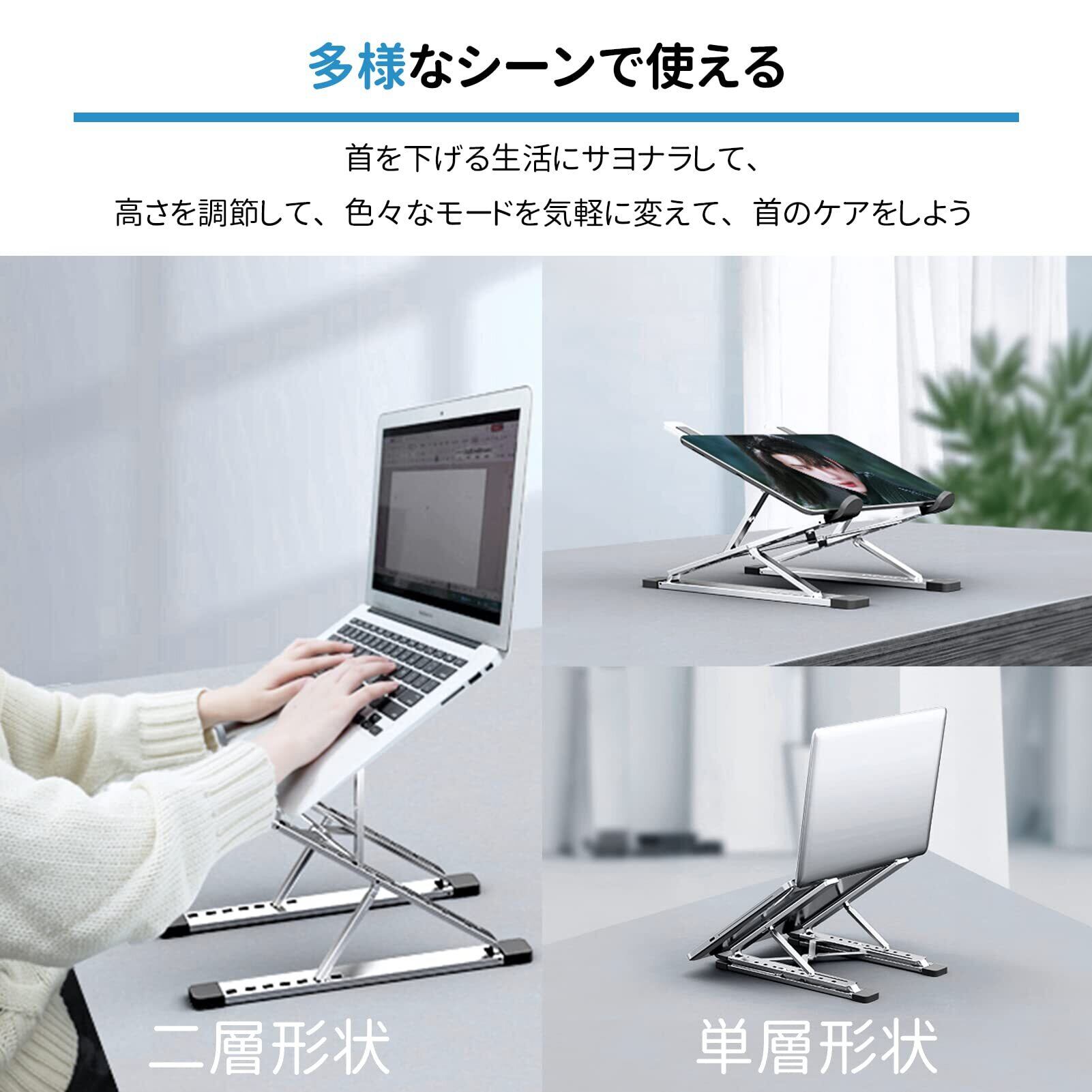 【高さ・角度自在に調整】パソコンスタンドは、自分の身長や姿勢に合わせて高さ(最大310mmまで)や角度を自由に調整できます。正しい姿勢でパソコン作業ができるので、首や肩の疲れ、背中の負担を軽減し、猫背などの姿勢矯正にも効果的です。