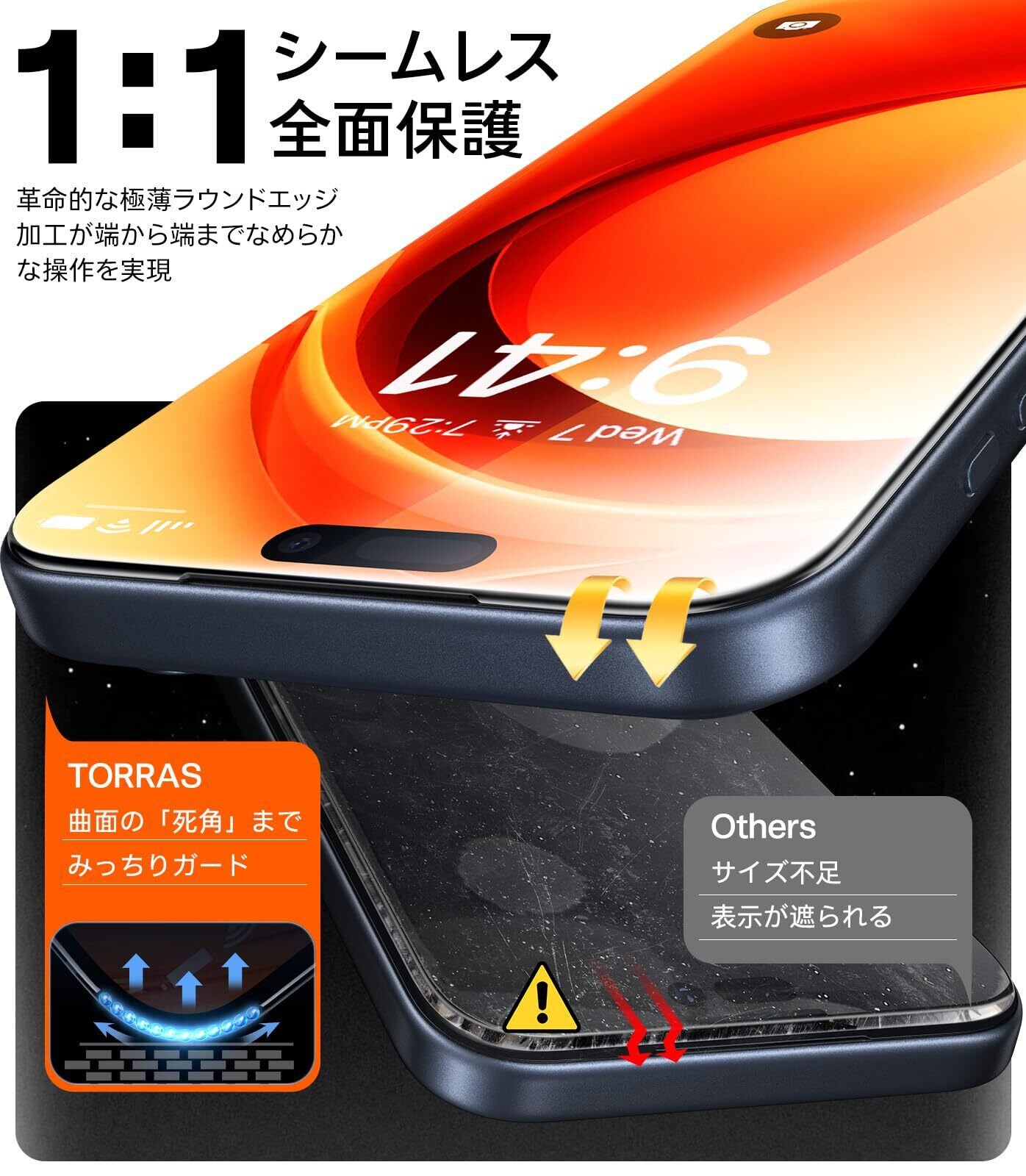 【航空宇宙技術採用! 231cm落下耐衝撃で「画面破損リスクゼロ」】TORRAS For iPhone 17 Pro ガラスフィルムは、航空宇宙技術(AGC「Dragontrail Pro」)により9H+Hv673の世界トップ硬度を実現。釘・鍵の傷や231cm落下(市販品比5倍耐性) からスマホの画面を防護。世界9,600万枚販売&画面破損報告0件※(※自社調べ)の実績だからこそ、高額修理代や突然の画面割れストレスから確実に解放へ。※お子様やペットがいる家庭でも、日常的に安心して使用できます。美観を追求するならTORRAS For iPhone17 Pro ケースとの併用で、全方位保護を完成させましょう。(For iPhone 17 Pro ガラスフィルム)