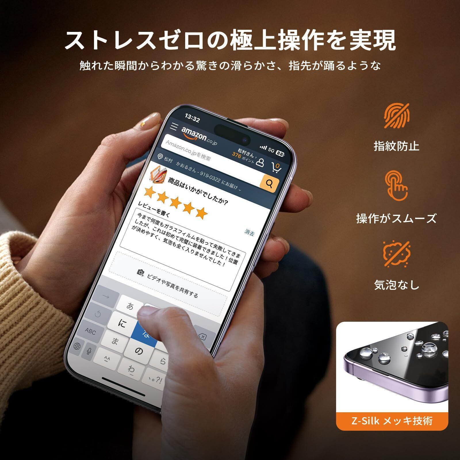【指紋防止&究極のスムーズさ】スマホ フィルム 17は、日本AFナノコーティングと独自開発のZ-Silkメッキ技術を採用。汗・油汚れ・指紋を効果的に防止し、画面上での指の動きをさらに滑らかにします。0.33ミリの超薄型デザインで装着感はほぼゼロ。スマホの操作感を新たな高みへ。特にゲーマーに最適-毎回のスワイプが正確に指に追従し、スキル発動を一歩早くサポート!さらに携帯フィルム 17の表面の16,000倍高密度分子層が汗と油を強力に防止し、画面を常に新品同様の清潔さに保ちます。1年以上持続する抜群の滑らかさを実現。
