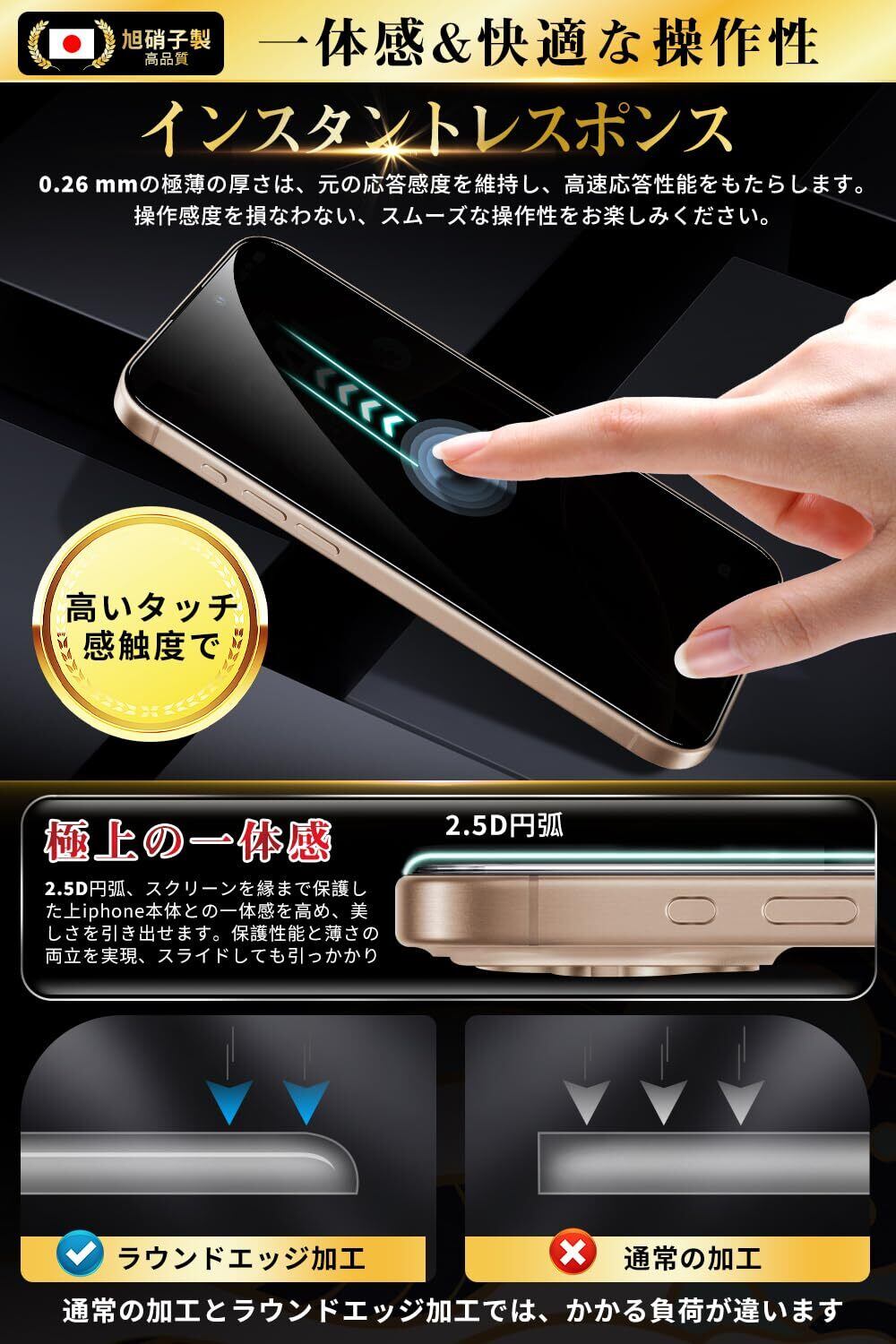 【日本旭硝子素材採用!圧倒的な耐衝撃性・飛散防止!】徹底的にこだわった品質、信頼できる日本製旭硝子素材を採用、通常ガラスフィルム などと比べ、強度、耐傷性、質感のすべてにおいて優れた性質を持ちます。安心してご使用いただけるように、一枚一枚、手作業で検品しておりました。また、iPhone 16 Pro ガラスフィルム卓越した耐衝撃性能を持って、落下への衝撃からしっかりと保護。万が一強力な衝撃でガラスフィルムが割れてしまっても、破片の飛び散りを防ぐ飛散防止コート処理で、画面をしっかり保護、スマートフォン をよく保護できます。