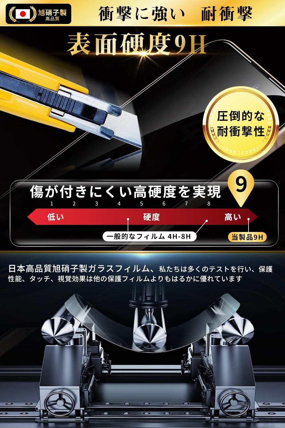 このフィルムは、日本旭硝子製で硬度9Hを誇り、日常の傷や衝撃に強い設計です。外部からの衝撃をしっかりと吸収し、画面の破損リスクを最小限に抑えます。万が一の衝撃にも耐えられる信頼性があります。