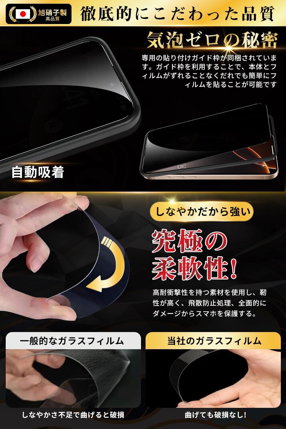 特徴 覗き見防止, 硬度9H, 撥水撥油, 指紋防止, 気泡ゼロ, 自動吸着