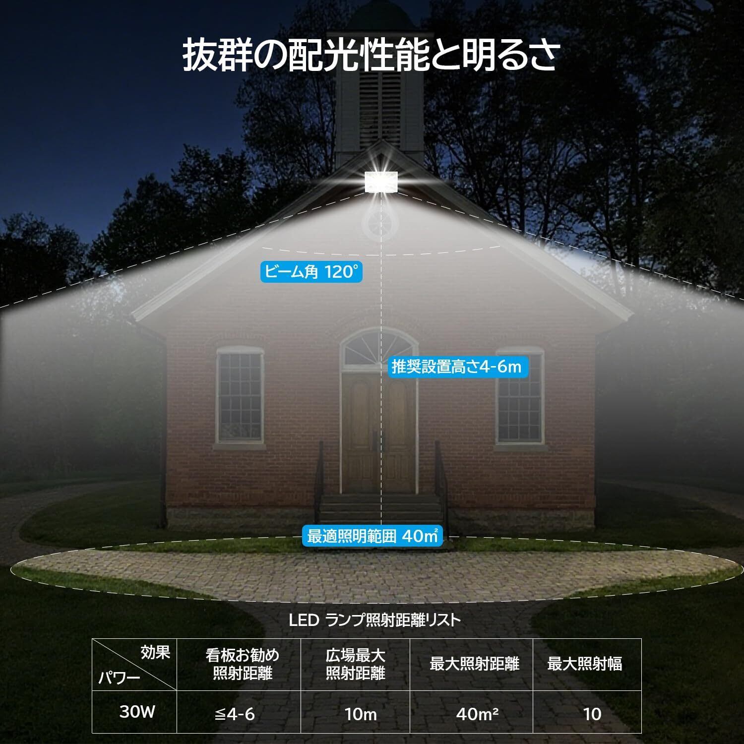 【主な仕様】:「30W LED投光器」;「色温:6500K(昼光色) 4000LM」;「ランプ本体の厚さは 4cm で、放熱効果と外観を両立しています」;「LED発光源:SMD3030」;「CRI >85」;「発光角度:120°」;「ケーブル:1.5m」;「入力電圧:AC 100-110V 50~60Hz」;「接地線付きプラグ」;「重さ:0.42kg 」;「防塵防水:IP66」; 「放熱設計:アルミ材質と櫛形ヒートシンク」;「リフレクターカップ:新型格子状ナノリフレクターカップ」。