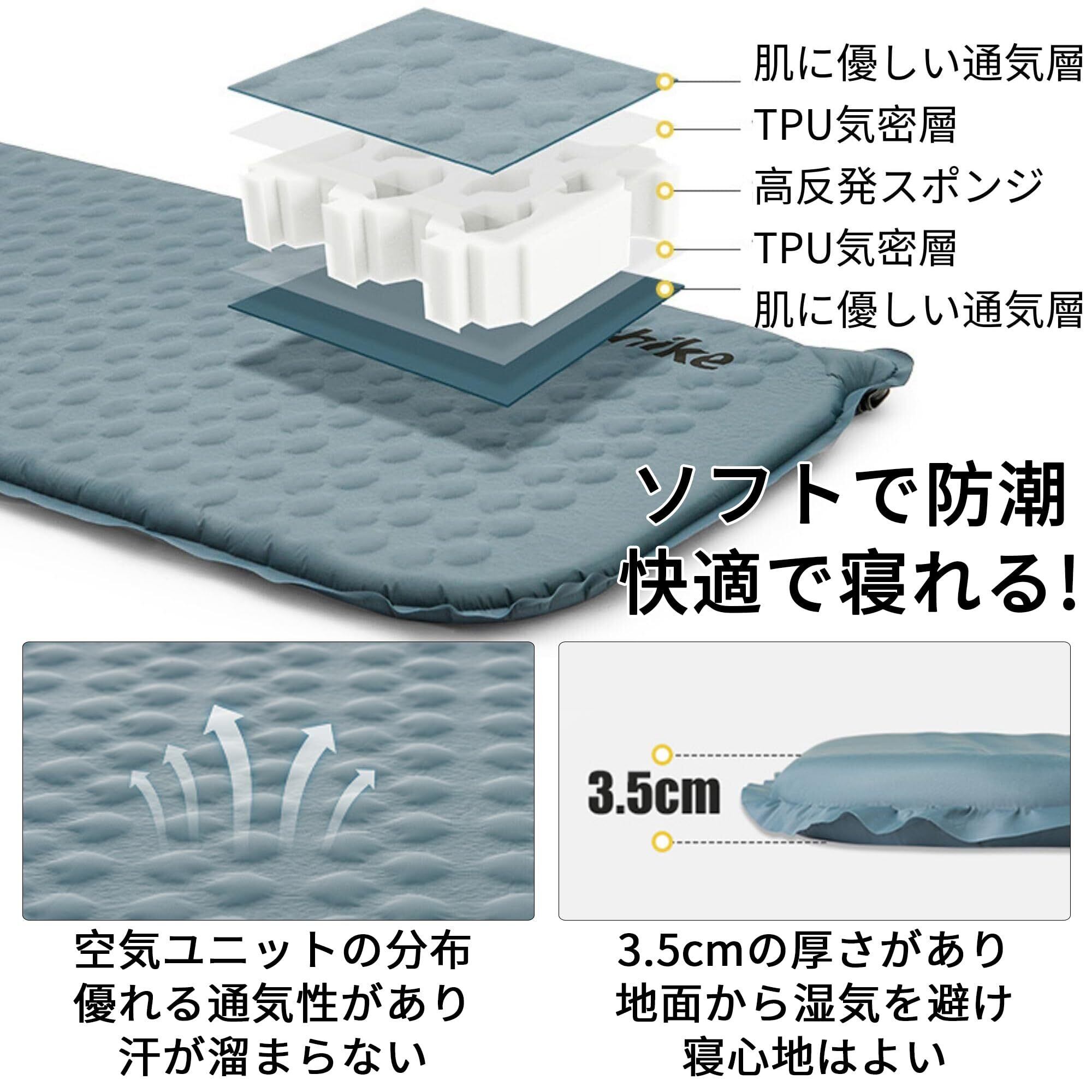 【よい寝心地】テントマットとして、快適な寝心地は一番大切です。こちらのキャンプマットは多層の素材があり、中には高反発なスポンジがあり、3.5cmの厚さに加え、横になったときにつっぱりません。この厚も地面から湿気を避け、より安心して使えます。さらに、車中泊マットの表面には空気ユニットの分布があり、肌に優しい通気層もあり、通気性に汗が溜まらないです。マットは高いクッション性を持ち、厚み3.5cmで車の段差や地面の凹凸を解消し、凹凸感を感じにくいので快適な睡眠を確保します。インフレーターマットは敷布団やベッドの役割を果たしてくれます。スリーピングバッグの下に敷くことで、地面の凸凹に影響を受けにくく、快適に眠ることができます。防潮の特性もありますので、アウトドアに使う時に、清潔を保ちます。