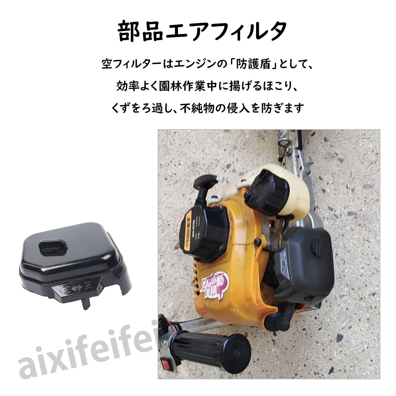 エアフィルターは、空気の流入を最適化し、エンジンのパフォーマンスを最大限に高める役割を果たします。このフィルターを使用することで、効率的に作業を行え、庭の手入れやアウトドアでの作業をスムーズに進めることができます。