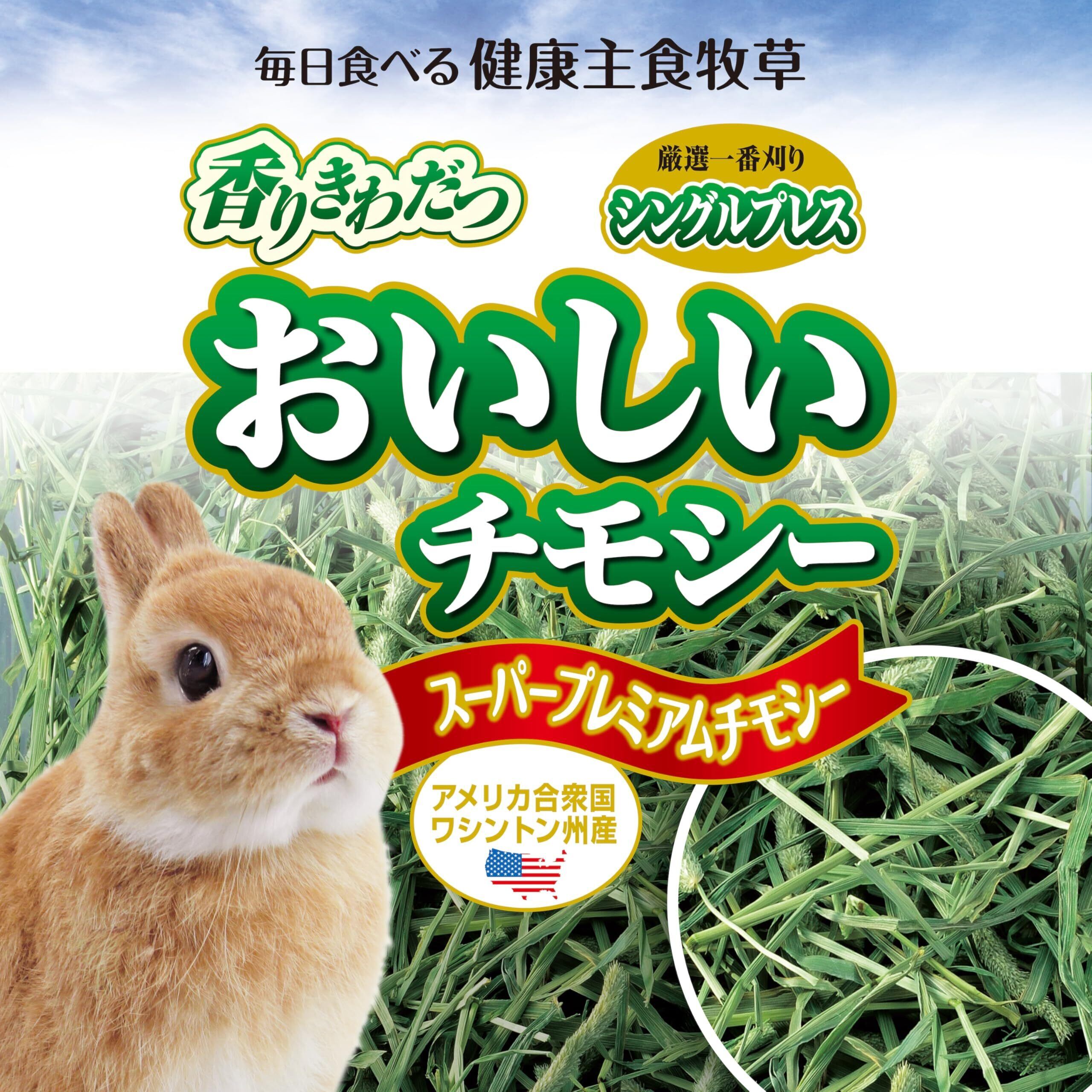 毎日食べる健康主食牧草 超ボリュームパック 香りきわだつスーパープレミアムチモシーを厳選一番刈りシングルプレス。おいしいチモシーは良質な一番刈りを厳選したチモシーです。 [スーパープレミアムチモシー]香りにこだわり、茶色い葉が少なく競走馬にも使用される最高級グレードの一番刈りチモシーを厳選して国内で袋詰めしています。 [シングルプレス(低圧縮)]高圧縮のダブルプレスよりも圧縮・カットしていないシングルプレスを採用。茎が太く穂がそのまま入っています。 [アメリカワシントン州産]アメリカワシントン州の広大な気候で育てられた高級チモシーの中でも厳しい基準をもとに選別されたものだけを使用しています。 [歯の健康維持]うさぎの歯は28本すべて一生伸び続ける常生歯です。丈の長い牧草をすり潰しながら噛むことで、歯の伸びすぎを抑え、歯の健康維持をサポートします。 [毛玉ケア]うさぎは飲み込んだものを口から吐き出せない動物です。チモシーに豊富に含まれる繊維質は、飲み込んだ毛を絡めながら排出し、お腹の健康維持をサポートします。 [低カロリー]主食として毎日食べる牧草は、高繊維でカロリーが低いチモシーが最適です。アルファルファベースのペレットフードと一緒に食べることで、バランスの取れた栄養をとることができます。 <与え方>うさぎ等の小動物の主食として、毎日常時食べられるように与えてください。給餌した牧草が減っていたら、その都度追加してください。いつでも水が補給できるように、新鮮な水をご用意ください。 成分(分析例):たんぱく質11.9%、脂質1.69%、粗繊維37.3%、灰分8.3%、水分7.5%、カルシウム0.45%、マグネシウム0.13%、リン0.23%