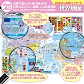 世界地図:各国の国旗と主要都市、ランドマークが地図に表示され、国際的な理解を深めます。旅行計画や国際関係の学習に役立ちます。世界各地の自然環境や動植物、国際機関や組織の情報も詳述。地理と生物学、国際関係を統合的に学べる豊富な情報量です。