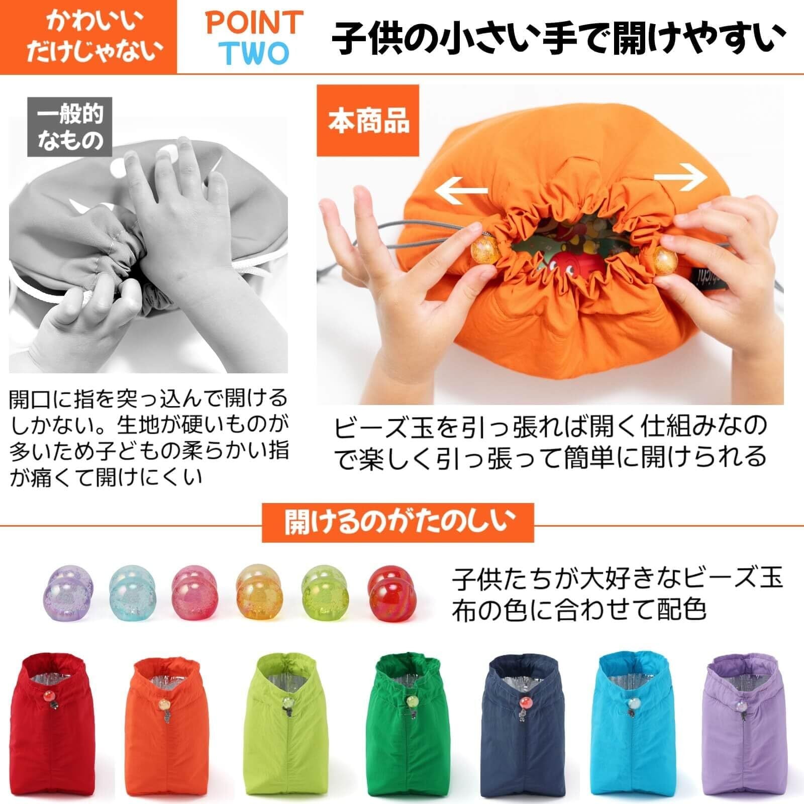 【子供の手で開けやすい】開口の両端にあるビーズ玉は可愛いだけでなく、子供をワクワクさせる仕組みがあります。市販一般の子供用ランチ巾着は開口に指を突っ込んで開けるしかありませんが、生地の硬いものが多いため子供の柔らかい指が痛くて開けにくいです。しかし本商品は、紐の反対側にビーズ玉を付けることによって「お母さんは紐を引っ張って締める、子供はビーズ玉を引っ張って開ける」という仕組みができています。「簡単に開けられる!」「開けるのがワクワクする~」使いはじめたらクセになりたのしいです。手をよく動かすことでお子さんの感覚感性を養うことにも役立ちます。