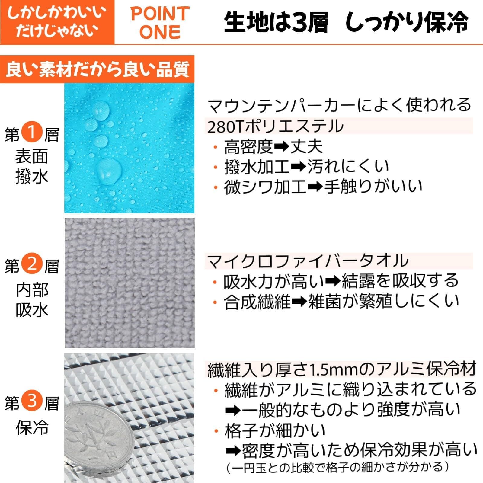 【子供だってしっかり保冷が必要】生地が3層も重なって、他にない保冷に長けた子供用ランチ巾着です。市販一般の簡易保冷のものに比べて、触ってみれば厚みがしっかりと伝わってきます。外側のマウンテンパーカー生地+真中のマイクロファイバータオル+内側の厚さ1.5mmのアルミ保冷材。3層生地のどれも品質にこだわったもので、相乗効果でしっかりと熱対流を防ぎ保冷効果が高いことが特徴です。これからの暑い季節にお子さんのお弁当をしっかりと保冷してくれます。