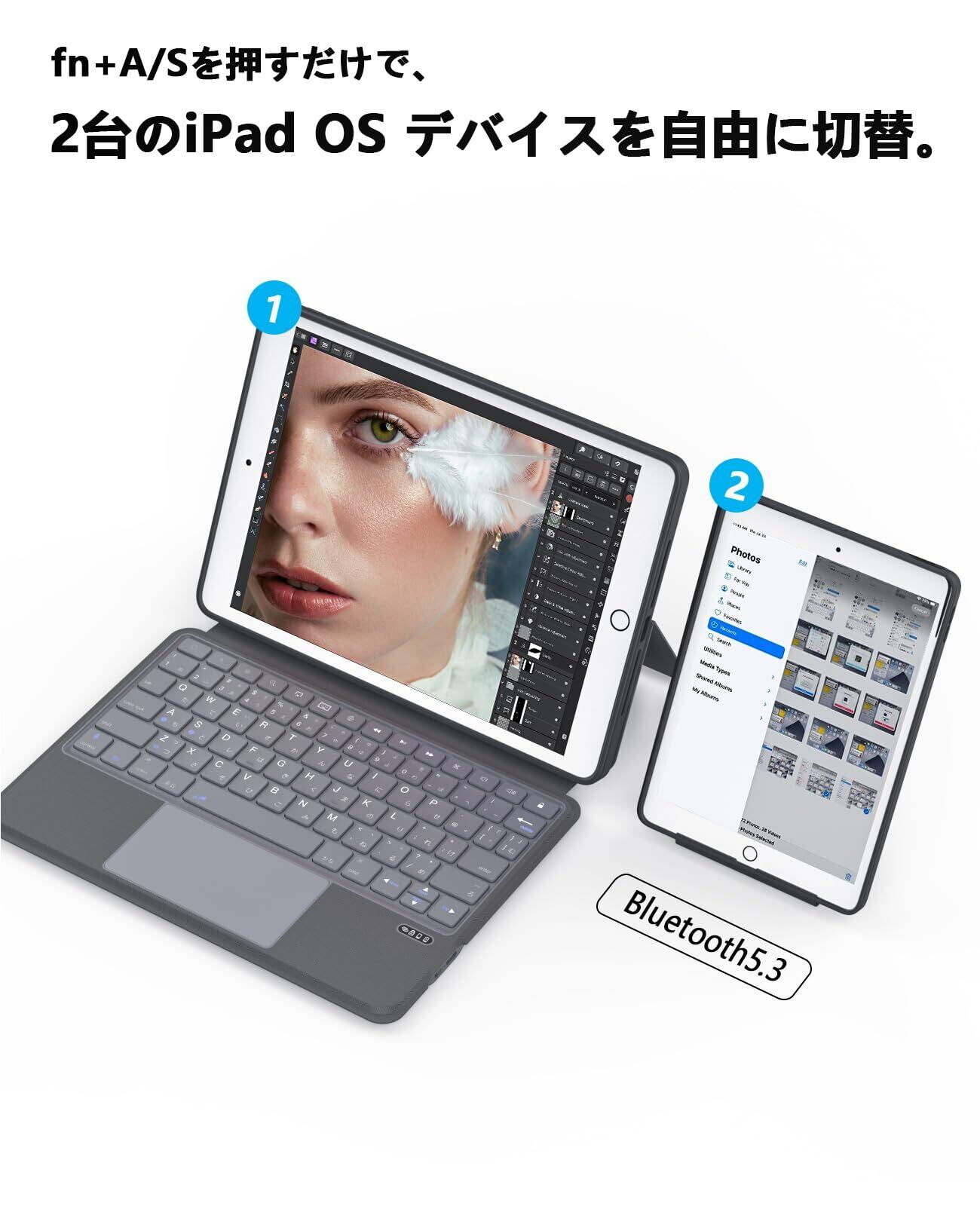[iPad 第9/8/7世代 キーボード付きケース Rucceko pro 10.5 air3 10.2/10.5インチアイパッド対応 磁気吸着 大きい高精度タッチパッド JIS日本語配列 bluetooth5.3キーボード ワイヤレス 2台のiPad OSデバイス切り替え 脱着式全面保護ケース スタンド機能付き 横縦置き可能 ブルートゥース keyboard タブレット カバー グレー]