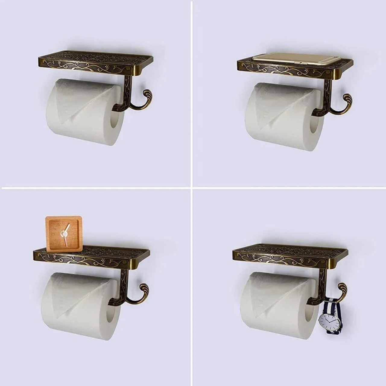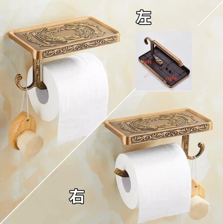 【KWQKEM】トイレットペーパーホルダーフック付き 真鍮 アンティーク調 ペーパーホルダー 壁取り付け 欧風 おしゃれ 小物置き スマホ置き 棚付き 簡単取り付け ペーパーラック | allstore1