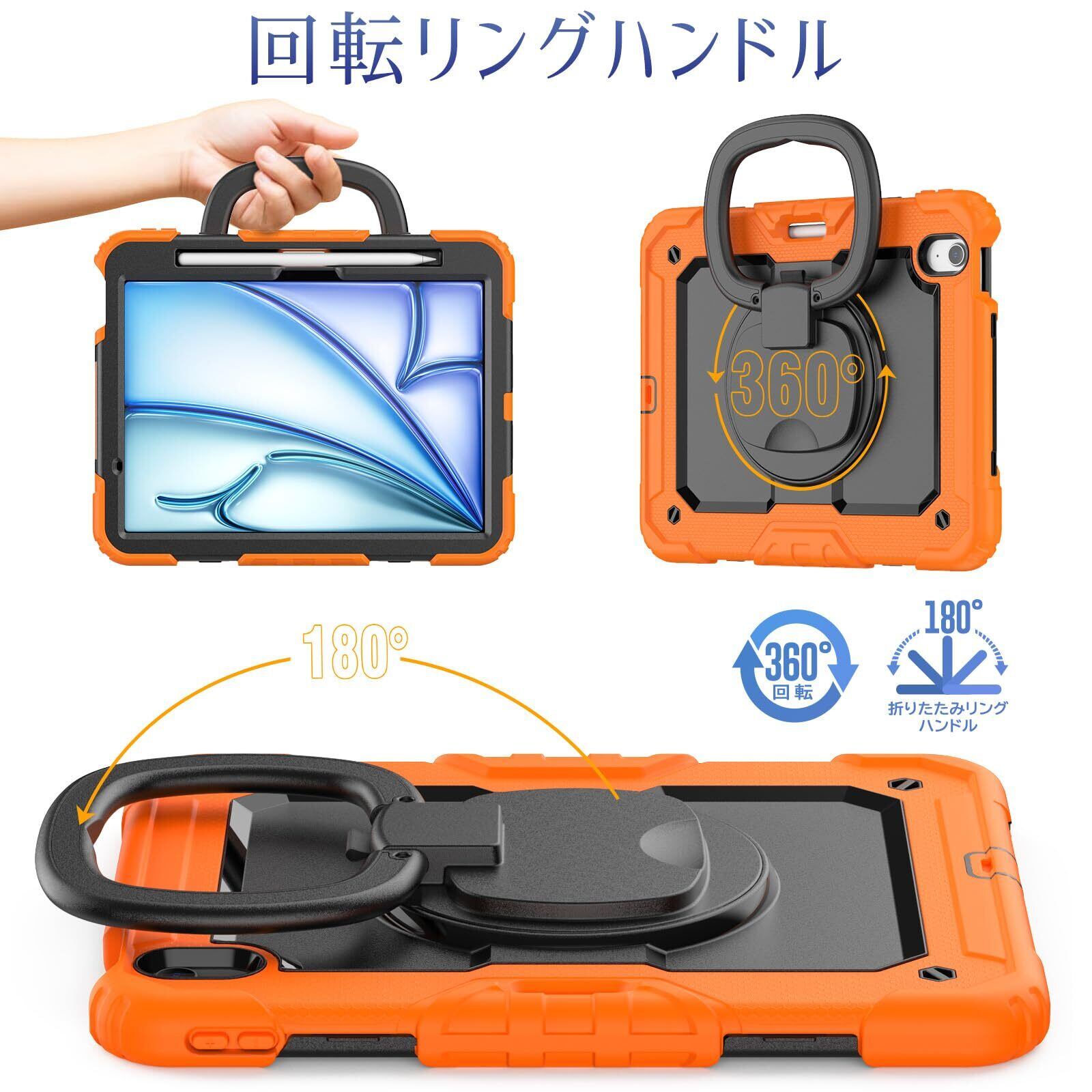 SEYMAC stock iPad Air(M3/M2) 11インチ(2025/2024)リングハンドル耐衝撃ケース 保護フィルム付き前面カバー ペン収納 360°回転リングハンドルスタンド ショルダーストラップ iPad Air 11 第7/6世代専用型(オレンジ) | allstore1
