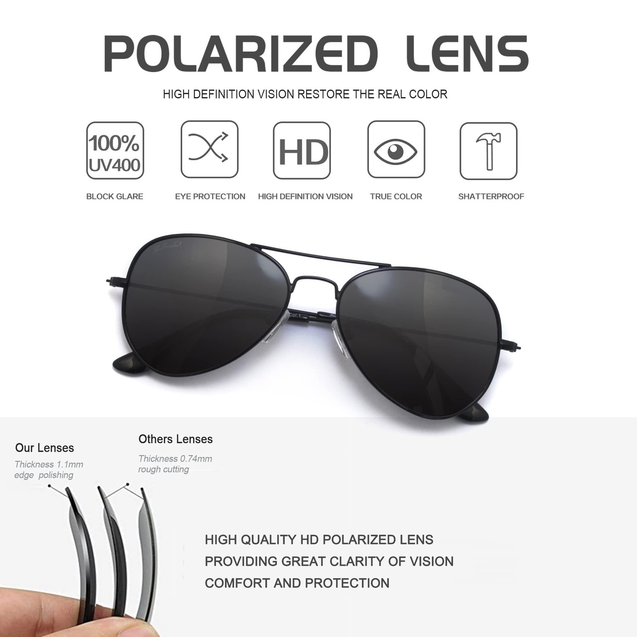 ▶UV保護サングラス:このサングラスは優れた標準に合格しているレンズを提供する。ANSI Z80.3:2018; 標準:EN ISO 12312-1:2013(A1:2015);標準:AS / NZS 1067.1:2016、紫外線、UV-A、UV-Bを100%カットするだけではなく、目に悪影響を及ぼすHEVも有効的にカットする。目への負担を軽減してくれる。路面・水面・雪面のギラつきをはじめ、自動車やビルのガラスからくる眩しい反射光などをカット、心地良い光を取り込むことによって、快適な視界を実現する。