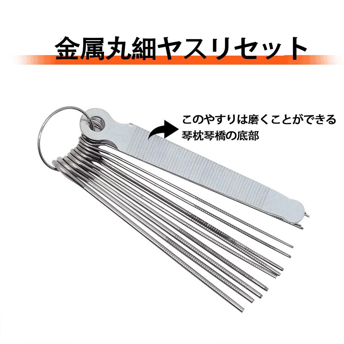 【簡単な使用方法】丸ヤスリは、弦の溝を研磨して滑らかな状態に仕上げることができます。長い軸のデザインにより、溝を削る際の取り扱いが非常に容易になっており、動作音が静かなのも特徴です。平ヤスリは、ナットやギターのブリッジの研磨に活用できます。