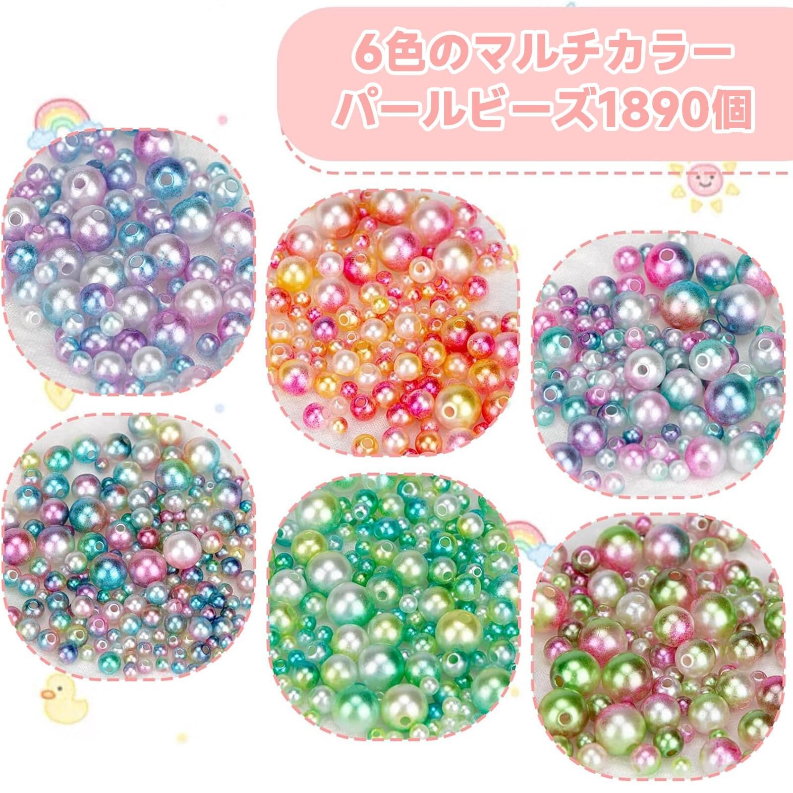 「[Meschett 1890Pcsパールビーズ]」は、6色のマルチカラーで構成されたパールビーズセットです。4mm、6mm、8mm、10mmのさまざまなサイズが揃っており、ブレスレットやネックレス、イヤリングなど、自由な発想でジュエリーを作成することができます。手作りの楽しさを広げるアイテムとして、さまざまなスタイルに合わせやすいデザインです!