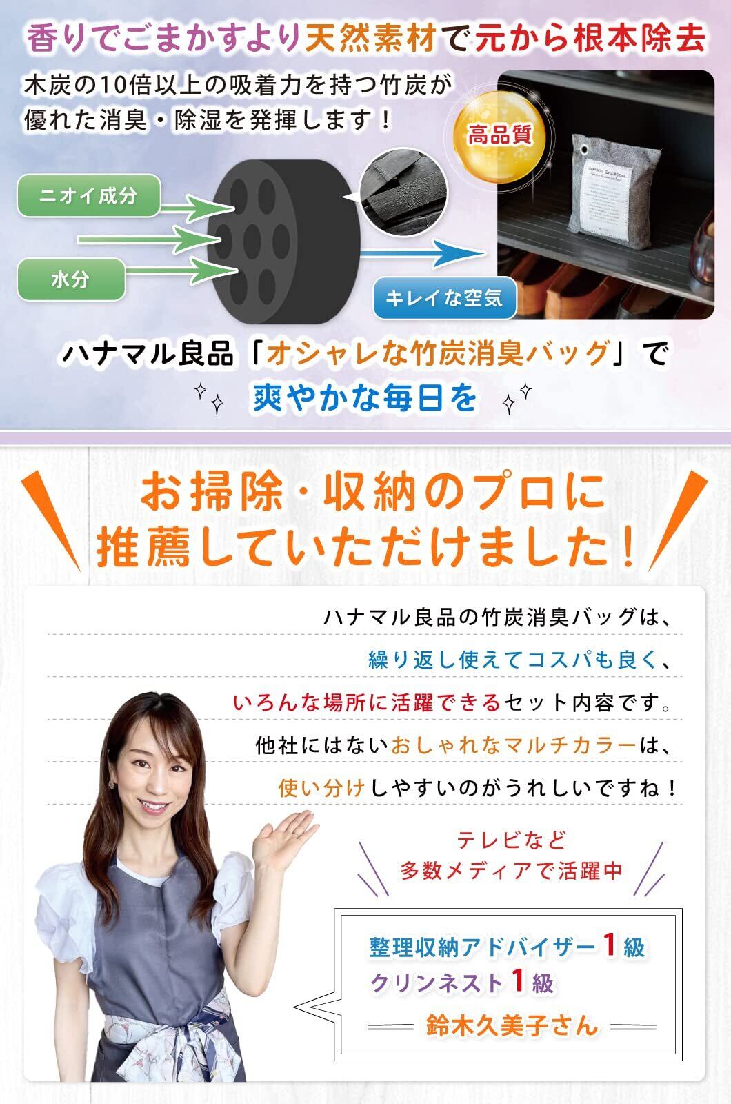 【消臭・除湿・抗菌 ニオイのモトから根本除去】 ハナマル良品の竹炭バッグは、 消臭 脱臭 除湿 効果を最大限に発揮するため、厳選された高品質の優れた竹炭のみを使用!木炭や備長炭の10倍の吸着力でニオイのモトから根本除去!天然の竹炭ですので、香でごまかす 消臭剤 とは違い、 無臭 でイヤなニオイと混ざることなく自然で爽やかな環境でご使用いただけます。また、 調湿 効果にも優れており 除湿剤 として 湿気取り にも最適です!空気中のニオイ物質や水分を吸着し、空気の清浄と雑菌の繁殖を防ぐ 抗菌 作用!