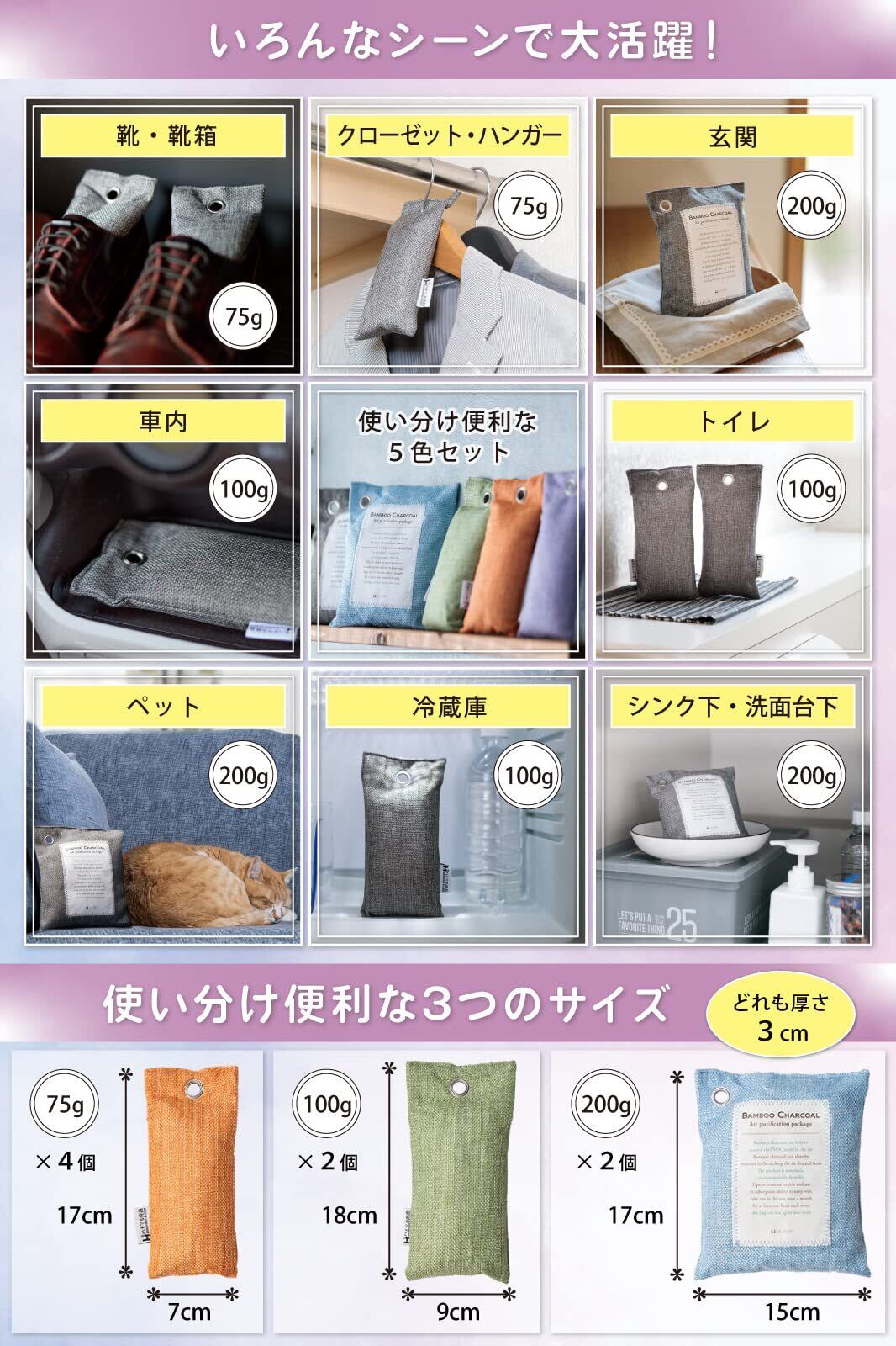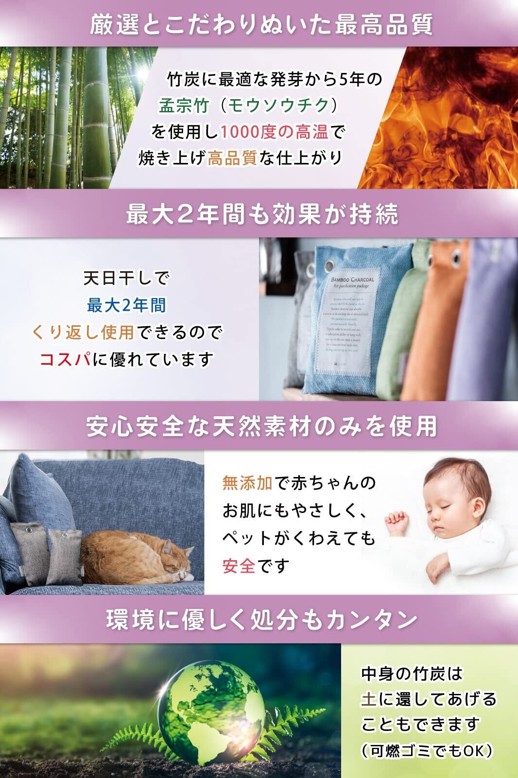 【コスパに優れた高品質と安心・安全素材】天日干しで最大2年間くり返し使用できるのでコスパに優れて経済的。竹炭の粉が漏れ出る心配がない、耐久性に優れた二重構造。無添加 で 天然素材 のみを使用していますので 赤ちゃん や ペット がいるご家庭でも安心してお使いいただけます。もちろん、環境に優しく処分もカンタン。使い終わった後は可燃ゴミとして捨てるのが一般的ですが、中身の 竹炭 は土に還したり、肥料として使用していただくこともできます。