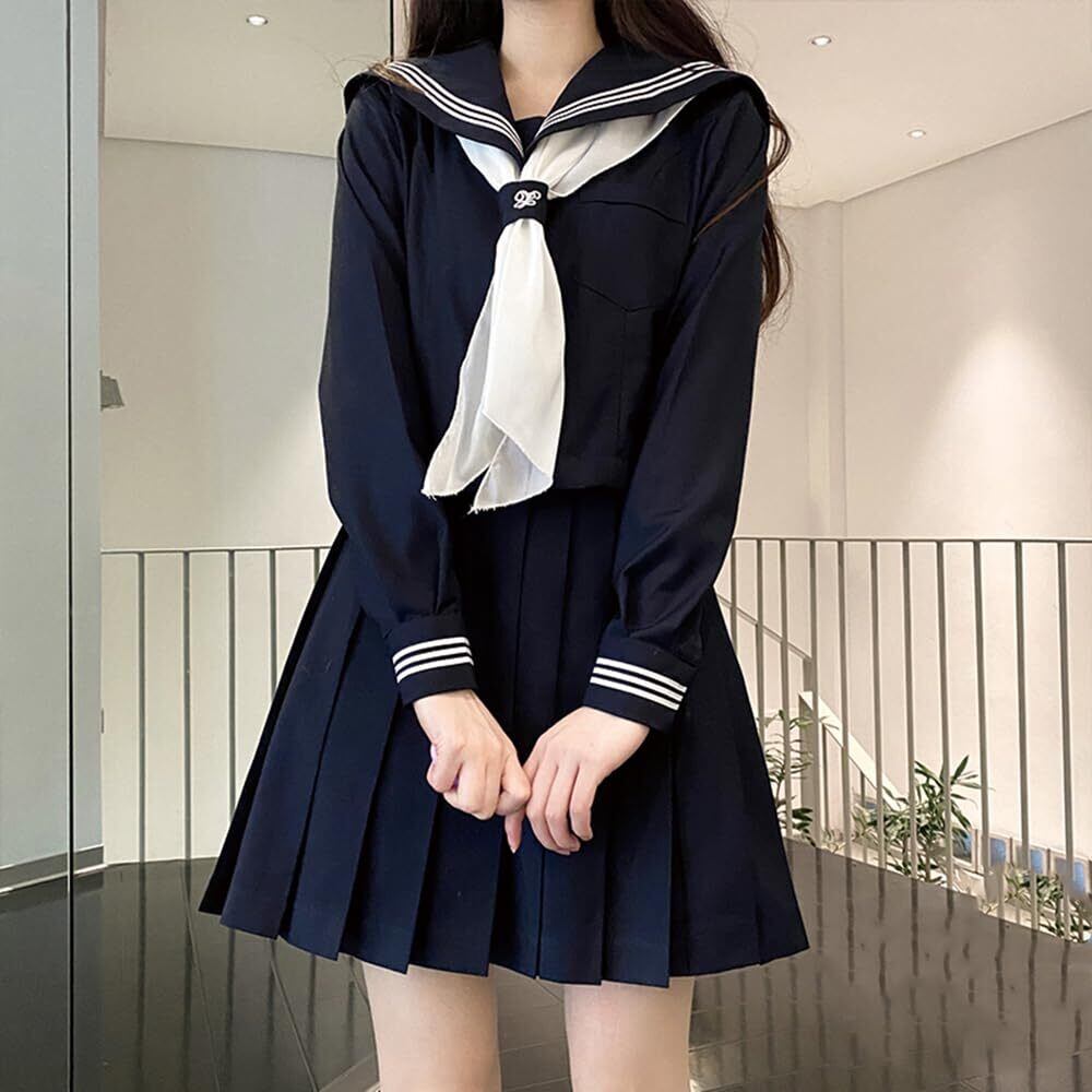 GSYCL セーラー服 紺色 女子高生 3点セット ハロウィン 仮装 JK 制服 コスチューム 長袖 前開き 上下セット プリーツスカート 人気 女子制服 本格制服 紺三本 文化祭 学园歳 卒業式 清純 可愛い ネイビー (M) | allstore1
