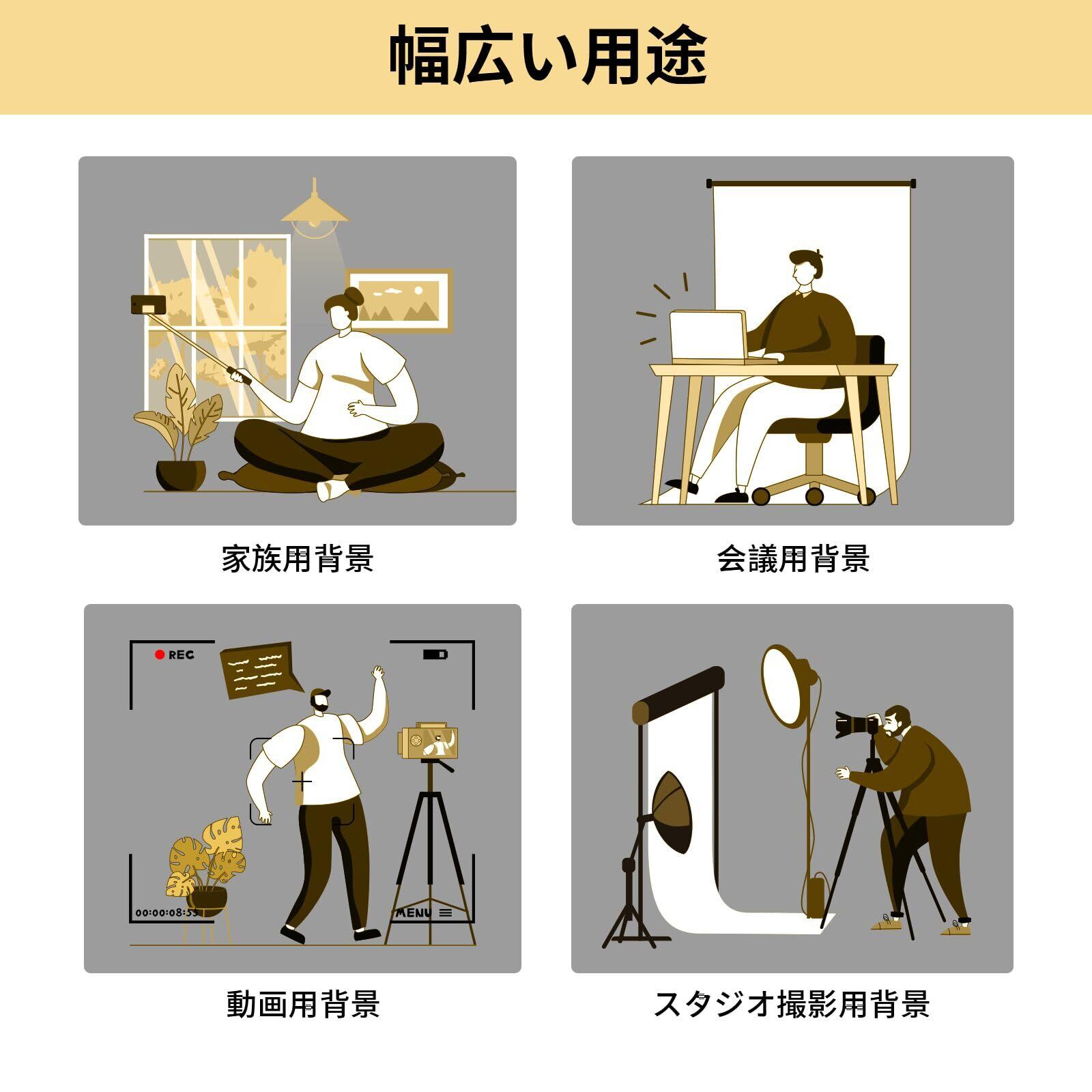 この背景布は、無反射布を使用しているため、撮影時の光の反射を抑え、理想的な写りを実現します。様々な光条件でも安心して使用でき、スタジオや屋外など、シーンを選ばず活躍します。初心者からプロまで満足できる高品質な素材です。